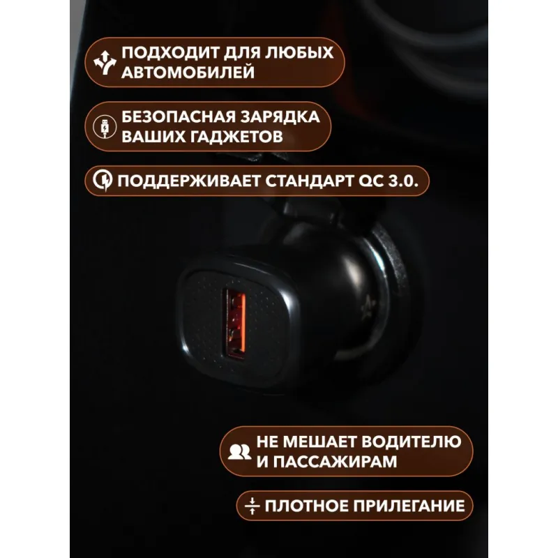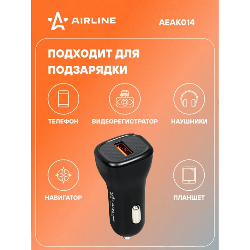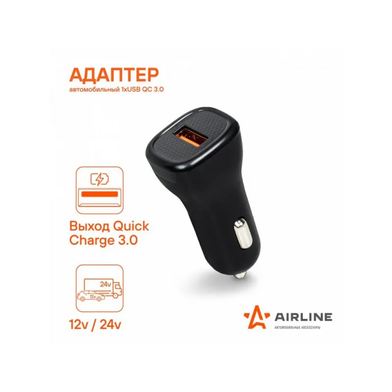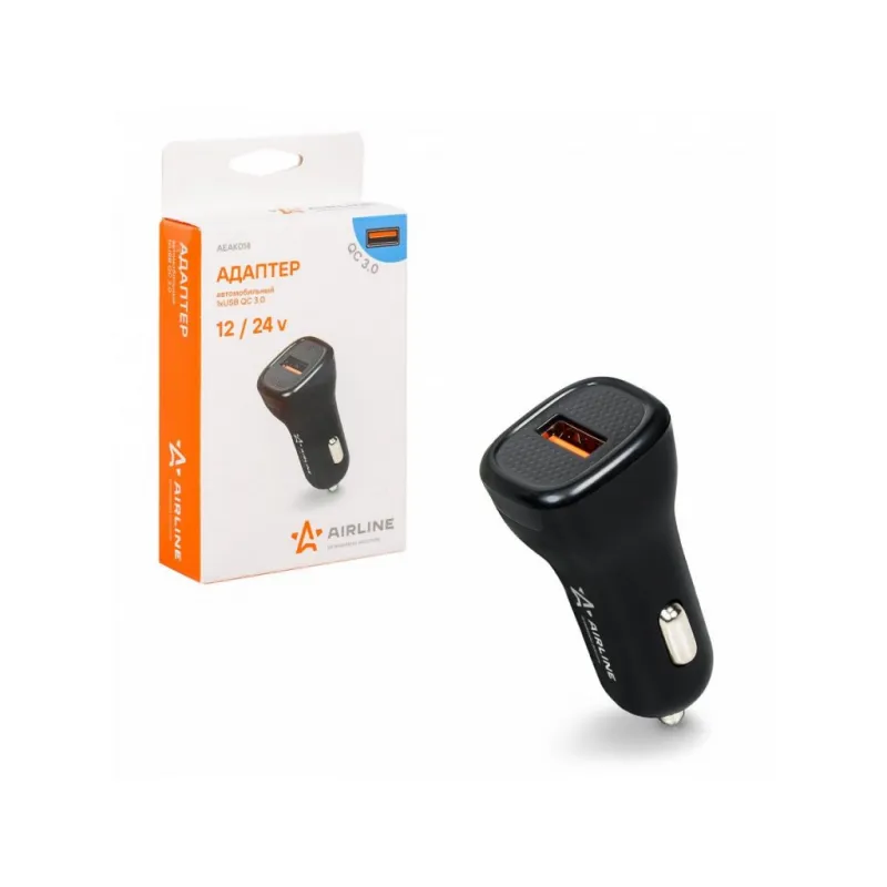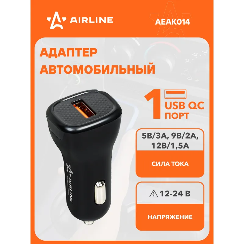 Адаптер автомобильный 1хUSB QC 3.0 12/24В Описание: Превратите ваш автомобильный прикуриватель в многофункциональное зарядное устройство с помощью автомобильного адаптера USB Type-C AIRLINE AEAK014 12/24В! Этот компактный и эффективный адаптер идеально подходит для любого автомобиля, обеспечивая надежное зарядное устройство для всех ваших портативных устройств. Просто вставьте его в гнездо прикуривателя вашего автомобиля, и он будет готов к использованию. Адаптер имеет 1 выход USB QC 3.0, вы сможете зарядить ваше устройство при помощи стандарта быстрой зарядки QC 3.0. Преимущества: Поддерживает стандарт быстрой зарядки QC 3.0. Вы сможете без проблем зарядить свой телефон, ноутбук, планшет и другие устройства, которые можно подключить в USB. Адаптер в прикуриватель - это идеальный и практичный подарок, так как он подходит для любого автомобиля и будет очень полезен и позволит зарядить телефон в пути прямо в автомобиле. Подарите адаптер автовладельцу, мужу, другу, жене, на 23 февраля, 8 марта, новый год. В линейке AIRLINE, вы найдете широкий ассортимент высококачественных автотоваров для вашего автомобиля автомобильные адаптеры, автомобильные адаптеры с функцией быстрой зарядки или разветвители гнезда прикуривателя. Мы гарантируем качество и надежность наших товаров. Характеристики: Артикул: AEAK014 Напряжение питания, В: 12/24 Выход USB QC: 5В/3А, 9В/2А, 12В/1,5А Стандарт быстрой зарядки QC 3.0.: Да Комплектация: Адаптер - 1 шт Коробка - 1 шт Гарантия: от 1 года.