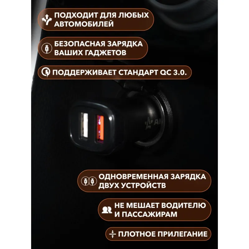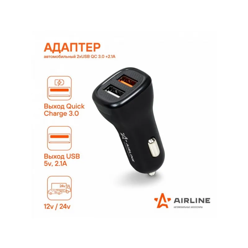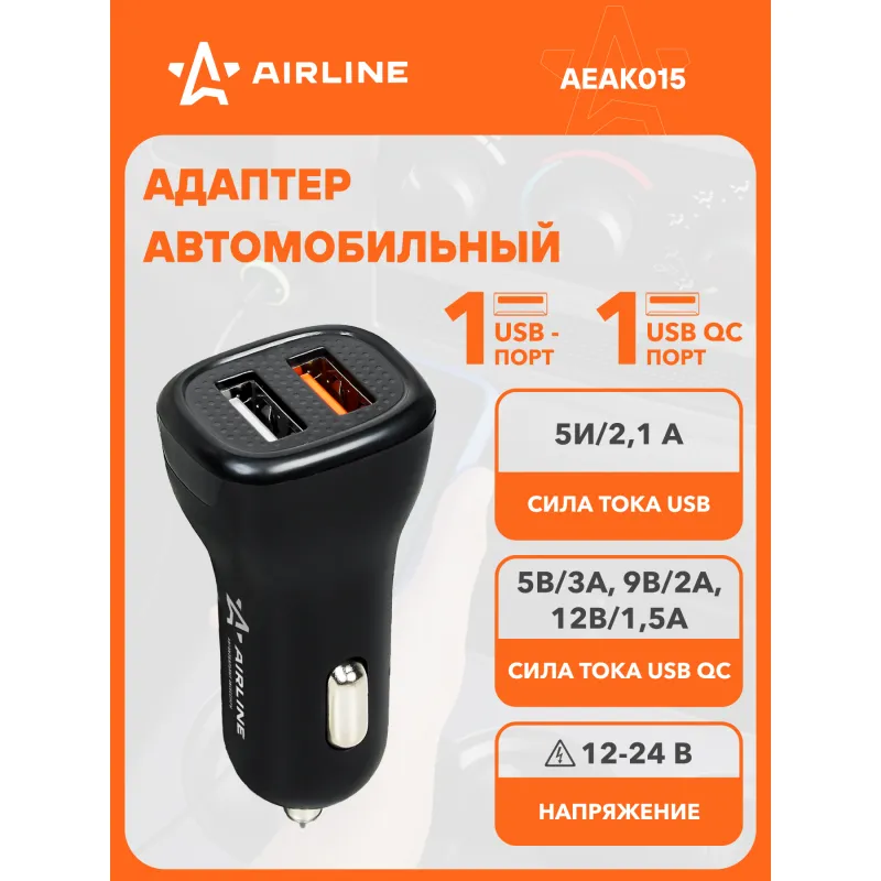 Адаптер автомобильный 2хUSB QC 3.0 + 2.1А 12/24В Описание: Превратите ваш автомобильный прикуриватель в многофункциональное зарядное устройство с помощью автомобильного адаптера USB Type-C AIRLINE AEAK015 12/24В! Этот компактный и эффективный адаптер идеально подходит для любого автомобиля, обеспечивая надежное зарядное устройство для всех ваших портативных устройств. Просто вставьте его в гнездо прикуривателя вашего автомобиля, и он будет готов к использованию. Адаптер имеет 2 выхода USB QC 3.0 и 2.1А, вы сможете без проблем зарядить 2 ваших устройства от USB. Преимущества: Поддерживает стандарт быстрой зарядки QC 3.0. Вы сможете без проблем зарядить свой телефон, ноутбук, планшет и другие устройства, которые можно подключить в USB. Вы также можете заряжать сразу 2 устройства одновременно. Адаптер в прикуриватель - это идеальный и практичный подарок, так как он подходит для любого автомобиля и будет очень полезен и позволит зарядить телефон в пути прямо в автомобиле. Подарите адаптер автовладельцу, мужу, другу, жене, на 23 февраля, 8 марта, новый год. В линейке AIRLINE, вы найдете широкий ассортимент высококачественных автотоваров для вашего автомобиля автомобильные адаптеры, автомобильные адаптеры с функцией быстрой зарядки или разветвители гнезда прикуривателя. Мы гарантируем качество и надежность наших товаров. Характеристики: Артикул: AEAK015 Выход USB: 5В, 2.1А Напряжение питания, В: 12/24 Выход USB QC: 5В/3А, 9В/2А, 12В/1,5А Стандарт быстрой зарядки QC 3.0.: Да Комплектация: Адаптер - 1 шт Коробка - 1 шт Гарантия: от 1 года.