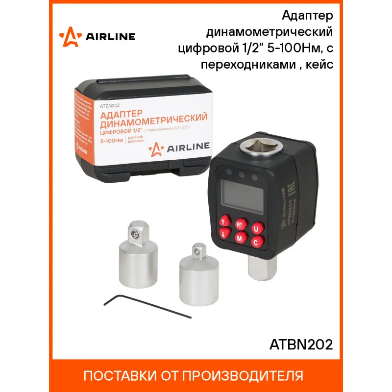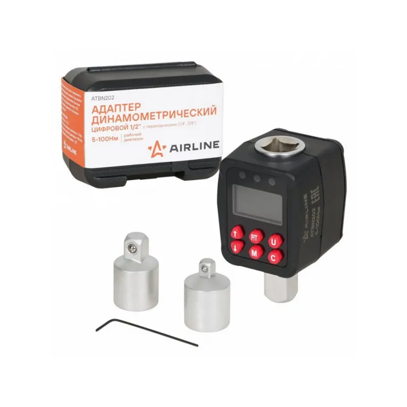 Адаптер динамометрический цифровой 1/2" 5-100Нм, с переходниками (1/4", 3/8"), кейс Описание: Динамометрический цифровой адаптер AIRLINE 1/2", 5–100 Нм, с переходниками (1/4", 3/8") (ATBN202) предназначен для точного измерения и контроля крутящего момента при работе с резьбовыми соединениями. Инструмент подходит для работы с различными крепежными элементами. Высокая точность с погрешностью всего ±2% обеспечивает надежность и безопасность затяжки, предотвращая повреждение резьбы. В комплекте предусмотрены переходники на 1/4" и 3/8", что делает адаптер универсальным для использования с головками разных размеров. Прочный корпус из ударопрочного АБС-пластика защищает устройство от механических воздействий, а компактный кейс упрощает хранение и транспортировку. Цифровой дисплей позволяет легко контролировать усилие затяжки, а в сочетании с трещоткой и торцовыми головками адаптер может использоваться как полноценный динамометрический ключ. Характеристики: Артикул: ATBN202 Погрешность, ±%: 2 Min значение рабочего диапазона, Нм: 5 Max значение рабочего диапазона, Нм: 100 Присоеденительный квдарат: 1/2" Комплектация: Адаптер динамометрический - 1 шт Переходник с 1/2" на 3/8" - 1 шт Переходник с 1/2" на 1/4" - 1 шт Шестигранник 1,4мм - 1 шт Инструкция пользователя - 1 шт Гарантия: от 1 года.