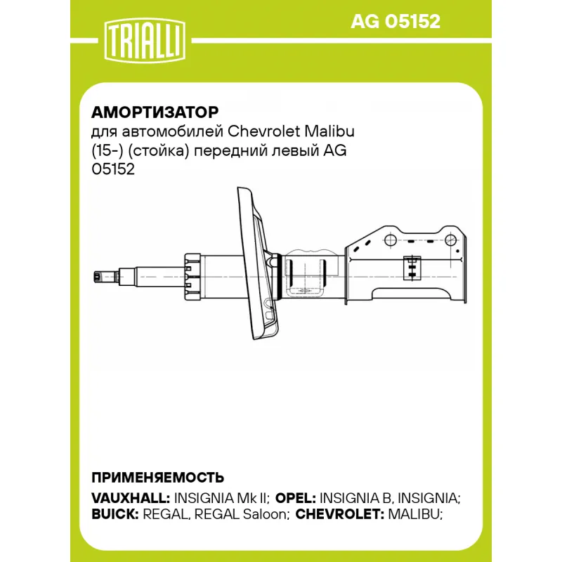 Амортизатор для автомобилей Chevrolet Malibu (15-) (стойка) передний левый Характеристики: Артикул: AG 05152 OEM номера: 84362037 Ход штока, мм: 110 Ось (сторона установки): Спереди, слева Тип амортизатора: Двухтрубный, гидравлический Вид амортизатора: Масляный с газовым подпором низкого давления Тип верхнего крепления: Шток Тип нижнего крепления: Скоба Диаметр корпуса, мм: 55 Диаметр штока, мм: 25 Размер резьбы штока: M14x1,5 Присоединительная длина 1, мм: 338 Присоединительная длина 2, мм: 502 Сопутствующий товар: Амортизаторы: AG 05353, AG 05503 Товарная линейка: BLACK Парный товар: AG 05353 Количество на автомобиль: 1 Дополнительная информация: Упаковка изделия может отличаться от представленной на фото Гарантийный срок: 2 года/60 000 км Комплектация: Амортизатор (стойка) передний - 1 шт Гайка крепежная - 1 шт Гарантия: от 1 года.