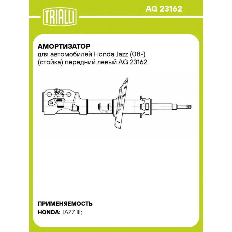Амортизатор для автомобилей Honda Jazz (08-) (стойка) передний левый Описание: Амортизатор AG 23162 бренда TRIALLI – это устройство для гашения колебаний (демпфирования) и поглощения толчков и ударов, действующих на раму. Особенности AG 23162: - Вид – Масляный с газовым подпором низкого давления; - Тип – Двухтрубный, гидравлический; Для крепления к деталям кузова или подвески используются крепления: верхнее Шток M12x1,25; и нижнее Скоба. Амортизатор в машину (стойка) имеет специальную площадку для установки пружины подвески. Совместим с: HONDA JAZZ.Подбор по VIN-номеру вашего автомобиля - через кнопку 'Задать вопрос'. Специалист проверит применяемость и ответит вам. Преимущества: - Инновационная технология производства; - Контроль качества каждой позиции по чертежам и с помощью 3D модели; - Сальник NOK; - Высокоэффективная система проектирования; - Гарантия до двух лет или 60 000 км пробега; Амортизаторы автомобильные существенно влияют на комфорт вождения, сокращая вибрации от неровностей дороги, что делает поездку более плавной и приятной. Регулярное и своевременное обслуживание амортизаторов помогут продлить их срок службы и обеспечить надёжную работу. Характеристики: Артикул: AG 23162 OEM номера: 51621TF0G03, 51621TF0G13, 51621TF0G23, 51621TG5C020M1, 51621TGOT03, 51621TK6A02, 51621TF0G21, 51621TF0G22, 51621TH5E00, 51621TH5E01, 51621TG5C02 Ход штока, мм: 184 Ось (сторона установки): Спереди, слева Тип амортизатора: Двухтрубный, гидравлический Вид амортизатора: Масляный с газовым подпором низкого давления Тип верхнего крепления: Шток Тип нижнего крепления: Скоба Диаметр корпуса, мм: 45 Диаметр штока, мм: 20 Размер резьбы штока: M12x1,25 Присоединительная длина 1, мм: 364 Присоединительная длина 2, мм: 548 Сопутствующий товар: Амортизаторы: AG 23363 Товарная линейка: BLACK Парный товар: AG 23363 Количество на автомобиль: 1 Дополнительная информация: Упаковка изделия может отличаться от представленной на фото Гарантийный срок: 2 года/60 000 км Комплектация: Гайка крепежная - 1 шт Амортизатор (стойка) передний - 1 шт Гарантия: от 1 года.