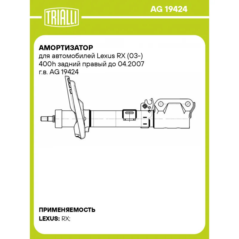 Амортизатор для автомобилей Lexus RX (03-) 400h задний правый до 04.2007 г.в. Характеристики: Артикул: AG 19424 OEM номера: 4853048190, 4853048200, 4853048240, 4853049405, 4853049415, 4853049545, A094314863 Ход штока, мм: 191 Ось (сторона установки): Сзади, справа Тип амортизатора: Двухтрубный, гидравлический Вид амортизатора: Масляный с газовым подпором низкого давления Тип верхнего крепления: Шток Тип нижнего крепления: Скоба Диаметр корпуса, мм: 51 Диаметр штока, мм: 22 Размер резьбы штока: M14x1,5 Присоединительная длина 1, мм: 424 Присоединительная длина 2, мм: 615 Сопутствующий товар: Амортизаторы: AG 19223 Товарная линейка: BLACK Парный товар: AG 19223 Количество на автомобиль: 1 Дополнительная информация: Упаковка изделия может отличаться от представленной на фото Гарантийный срок: 2 года/60 000 км Комплектация: Амортизатор задний - 1 шт Гайка крепежная - 1 шт Гарантия: от 1 года.