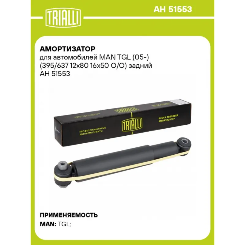 Амортизатор для автомобилей MAN TGL (05-) (395/637 12х80 16х50 O/O) задний Характеристики: Артикул: AH 51553 OEM номера: 85.43701-6007 Ход штока, мм: 242 Ось (сторона установки): Сзади, слева/справа Тип амортизатора: Двухтрубный, гидравлический Вид амортизатора: Масляный Тип верхнего крепления: Проушина/сайлентблок Тип нижнего крепления: Проушина/сайлентблок Диаметр корпуса, мм: 54 Диаметр штока, мм: 18 Присоединительная длина 1, мм: 395 Присоединительная длина 2, мм: 637 Товарная линейка: BLACK Количество на автомобиль: 2 Дополнительная информация: Упаковка изделия может отличаться от представленной на фото Гарантийный срок: 2 года/60 000 км Комплектация: Амортизатор задний - 1 шт Гарантия: от 1 года.