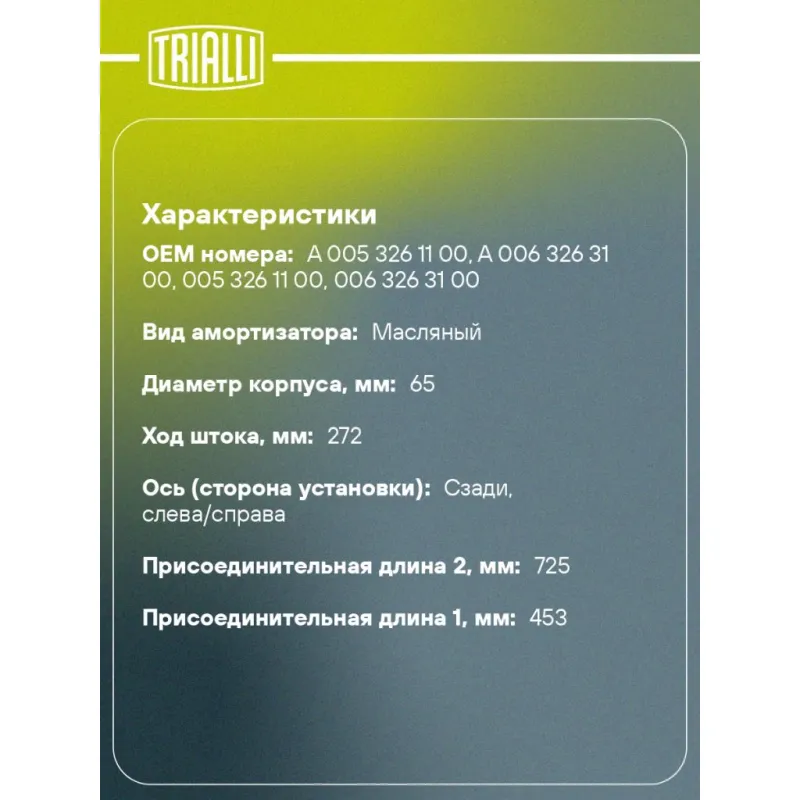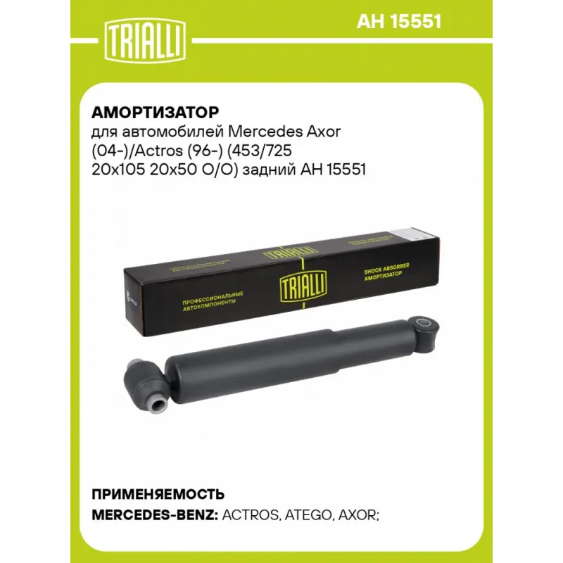 Амортизатор для автомобилей Mercedes Aхor (04-)/Actros (96-) (453/725 20x105 20x50 O/O) задний Характеристики: Артикул: AH 15551 OEM номера: A 005 326 11 00, A 006 326 31 00, 005 326 11 00, 006 326 31 00 Товарная линейка: BLACK Количество на автомобиль: 2 Вид амортизатора: Масляный Тип верхнего крепления: Проушина/сайлентблок Тип нижнего крепления: Проушина/сайлентблок Диаметр корпуса, мм: 65 Диаметр штока, мм: 20 Ход штока, мм: 272 Тип амортизатора: Двухтрубный, гидравлический Ось (сторона установки): Сзади, слева/справа Присоединительная длина 2, мм: 725 Присоединительная длина 1, мм: 453 Гарантийный срок: 2 года/60 000 км Комплектация: Шарнир резинометаллический - 2 шт Гарантийный талон - 1 шт Амортизатор задний - 1 шт Гарантия: от 1 года.