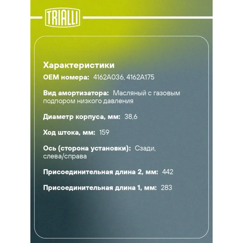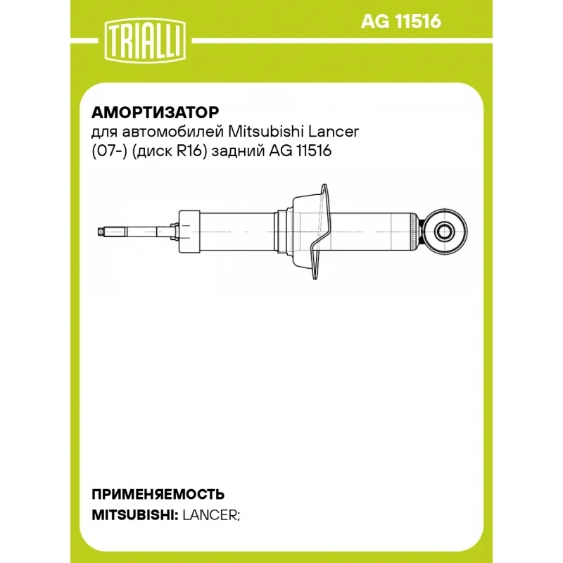 Амортизатор для автомобилей Mitsubishi Lancer (07-) (диск R16) задний Описание: Амортизатор AG 11516 бренда TRIALLI – это устройство для гашения колебаний (демпфирования) и поглощения толчков и ударов, действующих на раму. Особенности AG 11516: - Вид – Масляный с газовым подпором низкого давления; - Тип – Двухтрубный, гидравлический; Для крепления к деталям кузова или подвески используются крепления: верхнее Шток M10x1,25; и нижнее Проушина/сайлентблок. Совместим с: MITSUBISHI LANCER.Подбор по VIN-номеру вашего автомобиля - через кнопку 'Задать вопрос'. Специалист проверит применяемость и ответит вам. Преимущества: - Инновационная технология производства; - Контроль качества каждой позиции по чертежам и с помощью 3D модели; - Сальник NOK; - Высокоэффективная система проектирования; - Гарантия до двух лет или 60 000 км пробега; Амортизаторы автомобильные существенно влияют на комфорт вождения, сокращая вибрации от неровностей дороги, что делает поездку более плавной и приятной. Регулярное и своевременное обслуживание амортизаторов помогут продлить их срок службы и обеспечить надёжную работу. Характеристики: Артикул: AG 11516 OEM номера: 4162A036, 4162A175 Ход штока, мм: 159 Ось (сторона установки): Сзади, слева/справа Тип амортизатора: Двухтрубный, гидравлический Вид амортизатора: Масляный с газовым подпором низкого давления Тип верхнего крепления: Шток Тип нижнего крепления: Проушина/сайлентблок Диаметр корпуса, мм: 38,6 Диаметр штока, мм: 12,5 Размер резьбы штока: M10x1,25 Присоединительная длина 1, мм: 283 Присоединительная длина 2, мм: 442 Сопутствующий товар: Амортизаторы: AG 11517 Товарная линейка: BLACK Количество на автомобиль: 2 Дополнительная информация: Упаковка изделия может отличаться от представленной на фото Гарантийный срок: 2 года/60 000 км Комплектация: Амортизатор задний - 1 шт Гайка крепежная - 1 шт Гарантия: от 1 года.