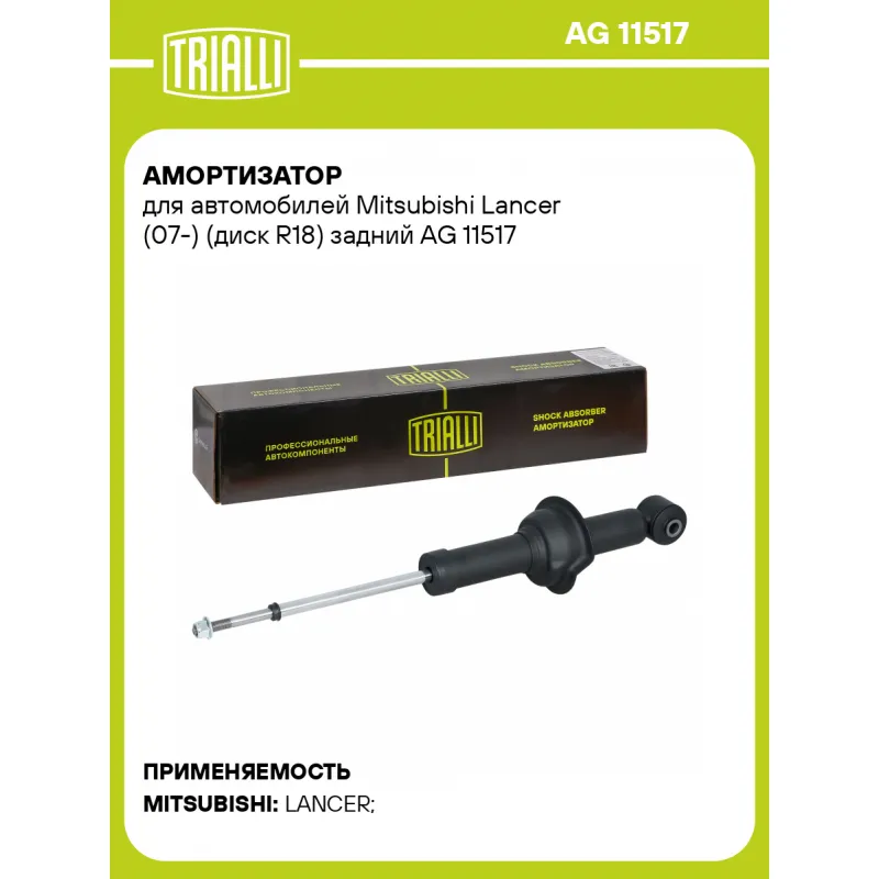 Амортизатор для автомобилей Mitsubishi Lancer (07-) (диск R18) задний Описание: Амортизатор AG 11517 бренда TRIALLI – это устройство для гашения колебаний (демпфирования) и поглощения толчков и ударов, действующих на раму. Особенности AG 11517: - Вид – Масляный с газовым подпором низкого давления; - Тип – Двухтрубный, гидравлический; Для крепления к деталям кузова или подвески используются крепления: верхнее Шток M10x1,25; и нижнее Проушина/сайлентблок. Совместим с: MITSUBISHI LANCER.Подбор по VIN-номеру вашего автомобиля - через кнопку 'Задать вопрос'. Специалист проверит применяемость и ответит вам. Преимущества: - Инновационная технология производства; - Контроль качества каждой позиции по чертежам и с помощью 3D модели; - Сальник NOK; - Высокоэффективная система проектирования; - Гарантия до двух лет или 60 000 км пробега; Амортизаторы автомобильные существенно влияют на комфорт вождения, сокращая вибрации от неровностей дороги, что делает поездку более плавной и приятной. Регулярное и своевременное обслуживание амортизаторов помогут продлить их срок службы и обеспечить надёжную работу. Характеристики: Артикул: AG 11517 OEM номера: 4162A122 Ход штока, мм: 159 Ось (сторона установки): Сзади, слева/справа Тип амортизатора: Двухтрубный, гидравлический Вид амортизатора: Масляный с газовым подпором низкого давления Тип верхнего крепления: Шток Тип нижнего крепления: Проушина/сайлентблок Диаметр корпуса, мм: 38,6 Диаметр штока, мм: 12,5 Размер резьбы штока: M10x1,25 Присоединительная длина 1, мм: 283 Присоединительная длина 2, мм: 442 Сопутствующий товар: Амортизаторы: AG 11516 Товарная линейка: BLACK Количество на автомобиль: 2 Дополнительная информация: Упаковка изделия может отличаться от представленной на фото Гарантийный срок: 2 года/60 000 км Комплектация: Амортизатор задний - 1 шт Гайка крепежная - 1 шт Гарантия: от 1 года.