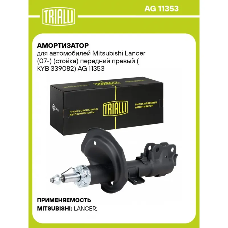 Амортизатор для автомобилей Mitsubishi Lancer (07-) (стойка) передний правый (аналог KYB 339082) Характеристики: Артикул: AG 11353 OEM номера: 4060A206, 4060A284 Ход штока, мм: 196 Ось (сторона установки): Спереди, справа Тип амортизатора: Двухтрубный, гидравлический Вид амортизатора: Масляный с газовым подпором низкого давления Тип верхнего крепления: Шток Тип нижнего крепления: Скоба Диаметр корпуса, мм: 51 Диаметр штока, мм: 22 Размер резьбы штока: M12x1,25 Присоединительная длина 1, мм: 353 Присоединительная длина 2, мм: 549 Сопутствующий товар: Амортизаторы: AG 11152 Товарная линейка: BLACK Парный товар: AG 11152 Количество на автомобиль: 1 Дополнительная информация: Упаковка изделия может отличаться от представленной на фото Гарантийный срок: 2 года/60 000 км Комплектация: Амортизатор (стойка) передний - 1 шт Гайка крепежная - 1 шт Гарантия: от 1 года.