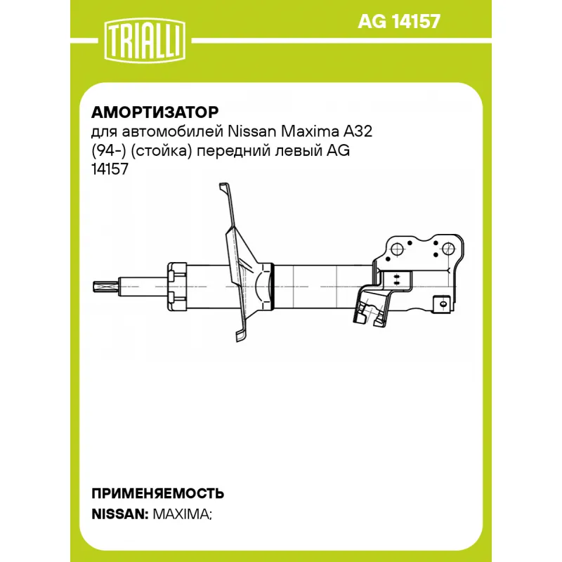 Амортизатор для автомобилей Nissan Maxima A32 (94-) (стойка) передний левый Характеристики: Артикул: AG 14157 OEM номера: 4421251200, 5430243U22, 5430331U13, 5430331U27, 5430331U85, 5430331U88, 5430343U23, 5430344U23, 5430344U28, 5430344U73, 5430344U75, 5430337U13, 5430337U26, 5430338U13, 5430338U26, 5430340U13, 5430340U85 Ход штока, мм: 190 Ось (сторона установки): Спереди, слева Тип амортизатора: Двухтрубный, гидравлический Вид амортизатора: Масляный с газовым подпором низкого давления Тип верхнего крепления: Шток Тип нижнего крепления: Скоба Диаметр корпуса, мм: 51 Диаметр штока, мм: 22 Размер резьбы штока: M12x1,25 Присоединительная длина 1, мм: 356 Присоединительная длина 2, мм: 546 Сопутствующий товар: Амортизаторы: AG 14358, AG 14522 Товарная линейка: BLACK Парный товар: AG 14358 Количество на автомобиль: 1 Дополнительная информация: Упаковка изделия может отличаться от представленной на фото Гарантийный срок: 2 года/60 000 км Комплектация: Амортизатор (стойка) передний - 1 шт Гайка крепежная - 1 шт Шайба - 1 шт Гарантия: от 1 года.