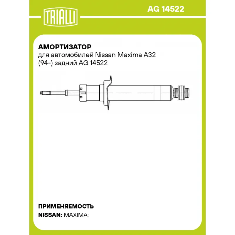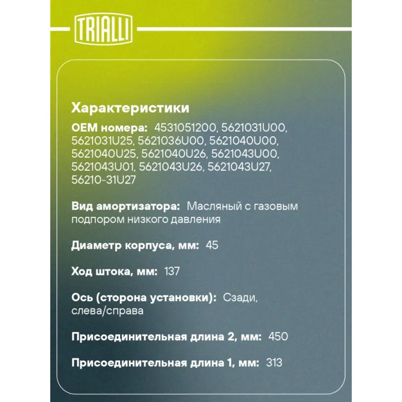 Амортизатор для автомобилей Nissan Maxima A32 (94-) задний Описание: Амортизатор AG 14522 бренда TRIALLI – это устройство для гашения колебаний (демпфирования) и поглощения толчков и ударов, действующих на раму. Особенности AG 14522: - Вид – Масляный с газовым подпором низкого давления; - Тип – Двухтрубный, гидравлический; Для крепления к деталям кузова или подвески используются крепления: верхнее Шток M10x1,25; и нижнее Проушина/сайлентблок. Совместим с: NISSAN MAXIMA.Подбор по VIN-номеру вашего автомобиля - через кнопку 'Задать вопрос'. Специалист проверит применяемость и ответит вам. Преимущества: - Инновационная технология производства; - Контроль качества каждой позиции по чертежам и с помощью 3D модели; - Сальник NOK; - Высокоэффективная система проектирования; - Гарантия до двух лет или 60 000 км пробега; Амортизаторы автомобильные существенно влияют на комфорт вождения, сокращая вибрации от неровностей дороги, что делает поездку более плавной и приятной. Регулярное и своевременное обслуживание амортизаторов помогут продлить их срок службы и обеспечить надёжную работу. Характеристики: Артикул: AG 14522 OEM номера: 4531051200, 5621031U00, 5621031U25, 5621036U00, 5621040U00, 5621040U25, 5621040U26, 5621043U00, 5621043U01, 5621043U26, 5621043U27, 56210-31U27 Ход штока, мм: 137 Ось (сторона установки): Сзади, слева/справа Тип амортизатора: Двухтрубный, гидравлический Вид амортизатора: Масляный с газовым подпором низкого давления Тип верхнего крепления: Шток Тип нижнего крепления: Проушина/сайлентблок Диаметр корпуса, мм: 45 Диаметр штока, мм: 12,5 Размер резьбы штока: M10x1,25 Присоединительная длина 1, мм: 313 Присоединительная длина 2, мм: 450 Сопутствующий товар: Амортизаторы: AG 23160, AG 14155 Товарная линейка: BLACK Количество на автомобиль: 2 Дополнительная информация: Упаковка изделия может отличаться от представленной на фото Гарантийный срок: 2 года/60 000 км Комплектация: Гайка крепежная - 1 шт Амортизатор задний - 1 шт Гарантия: от 1 года.