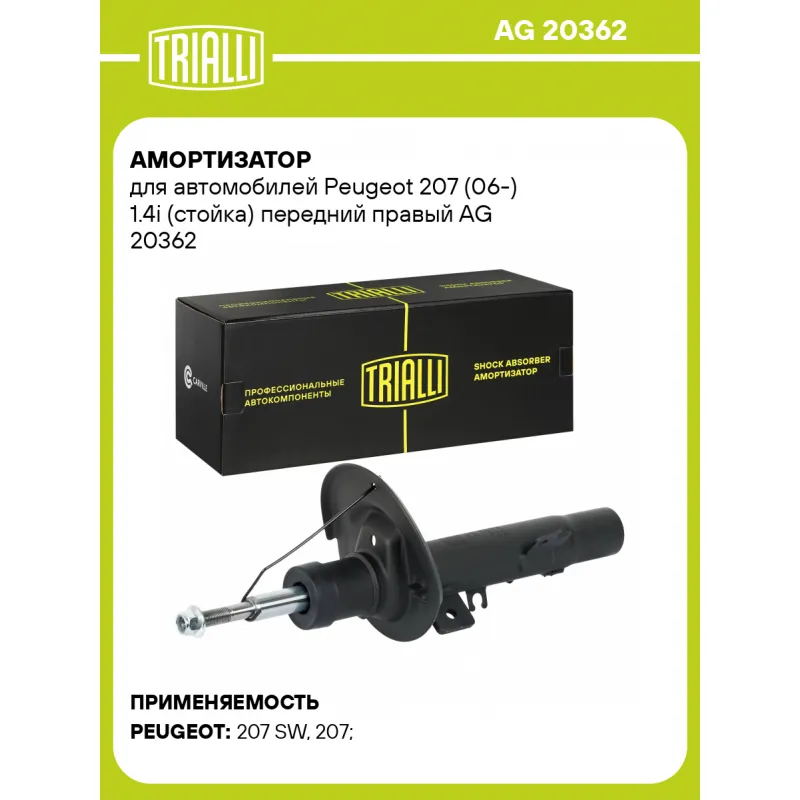 Амортизатор для автомобилей Peugeot 207 (06-) 1.4i (стойка) передний правый Описание: Амортизатор AG 20362 бренда TRIALLI – это устройство для гашения колебаний (демпфирования) и поглощения толчков и ударов, действующих на раму. Особенности AG 20362: - Вид – Масляный с газовым подпором низкого давления; - Тип – Двухтрубный, гидравлический; Для крепления к деталям кузова или подвески используются крепления: верхнее Шток M14x1,5; и нижнее Зажим. Амортизатор в машину (стойка) имеет специальную площадку для установки пружины подвески. Совместим с: PEUGEOT 207.Подбор по VIN-номеру вашего автомобиля - через кнопку 'Задать вопрос'. Специалист проверит применяемость и ответит вам. Преимущества: - Инновационная технология производства; - Контроль качества каждой позиции по чертежам и с помощью 3D модели; - Сальник NOK; - Высокоэффективная система проектирования; - Гарантия до двух лет или 60 000 км пробега; Амортизаторы автомобильные существенно влияют на комфорт вождения, сокращая вибрации от неровностей дороги, что делает поездку более плавной и приятной. Регулярное и своевременное обслуживание амортизаторов помогут продлить их срок службы и обеспечить надёжную работу. Характеристики: Артикул: AG 20362 OEM номера: 5202VJ, 520826 Ход штока, мм: 172 Ось (сторона установки): Спереди, справа Тип амортизатора: Двухтрубный, гидравлический Вид амортизатора: Масляный с газовым подпором низкого давления Тип верхнего крепления: Шток Тип нижнего крепления: Зажим Диаметр корпуса, мм: 51 Диаметр штока, мм: 22 Размер резьбы штока: M14x1,5 Присоединительная длина 1, мм: 290 Присоединительная длина 2, мм: 437 Сопутствующий товар: Амортизаторы: AG 20161, AG 20510 Товарная линейка: BLACK Парный товар: AG 20161 Количество на автомобиль: 1 Дополнительная информация: Упаковка изделия может отличаться от представленной на фото Гарантийный срок: 2 года/60 000 км Комплектация: Амортизатор (стойка) передний - 1 шт Гайка крепежная - 1 шт Гарантия: от 1 года.