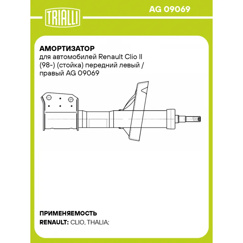 Амортизатор для автомобилей Renault Clio II (98-) (стойка) передний левый / правый Характеристики: Артикул: AG 09069 OEM номера: 7700428115, 7700434925, 8200126408, 7700839382, 7700428602, 8200662261, 7700428438, 8200662263, 7700839379, 8200662260 Ход штока, мм: 171 Ось (сторона установки): Спереди, слева/справа Тип амортизатора: Двухтрубный, гидравлический Вид амортизатора: Масляный с газовым подпором низкого давления Тип верхнего крепления: Шток Тип нижнего крепления: Скоба Диаметр корпуса, мм: 45 Диаметр штока, мм: 20 Размер резьбы штока: M14x1,5 Присоединительная длина 1, мм: 344 Присоединительная длина 2, мм: 515 Товарная линейка: BLACK Количество на автомобиль: 2 Дополнительная информация: Упаковка изделия может отличаться от представленной на фото Гарантийный срок: 2 года/60 000 км Комплектация: Амортизатор (стойка) передний - 1 шт Гайка крепежная - 1 шт Гарантия: от 1 года.