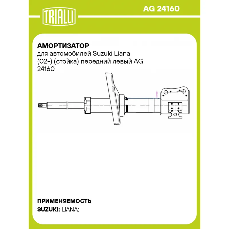 Амортизатор для автомобилей Suzuki Liana (02-) (стойка) передний левый Характеристики: Артикул: AG 24160 OEM номера: 4160254G50, 4160254G51, 4160255G10, 4160255G50 Ход штока, мм: 166 Ось (сторона установки): Спереди, слева Тип амортизатора: Двухтрубный, гидравлический Вид амортизатора: Масляный с газовым подпором низкого давления Тип верхнего крепления: Шток Тип нижнего крепления: Скоба Диаметр корпуса, мм: 45 Диаметр штока, мм: 20 Размер резьбы штока: M12x1,25 Присоединительная длина 1, мм: 321 Присоединительная длина 2, мм: 487 Сопутствующий товар: Амортизаторы: AG 24361, AG 24200, AG 24400 Товарная линейка: BLACK Парный товар: AG 24361 Количество на автомобиль: 1 Дополнительная информация: Упаковка изделия может отличаться от представленной на фото Гарантийный срок: 2 года/60 000 км Комплектация: Амортизатор (стойка) передний - 1 шт Гайка крепежная - 1 шт Шайба - 1 шт Гарантия: от 1 года.