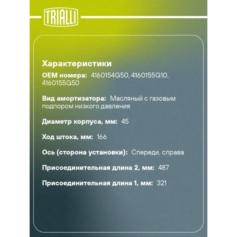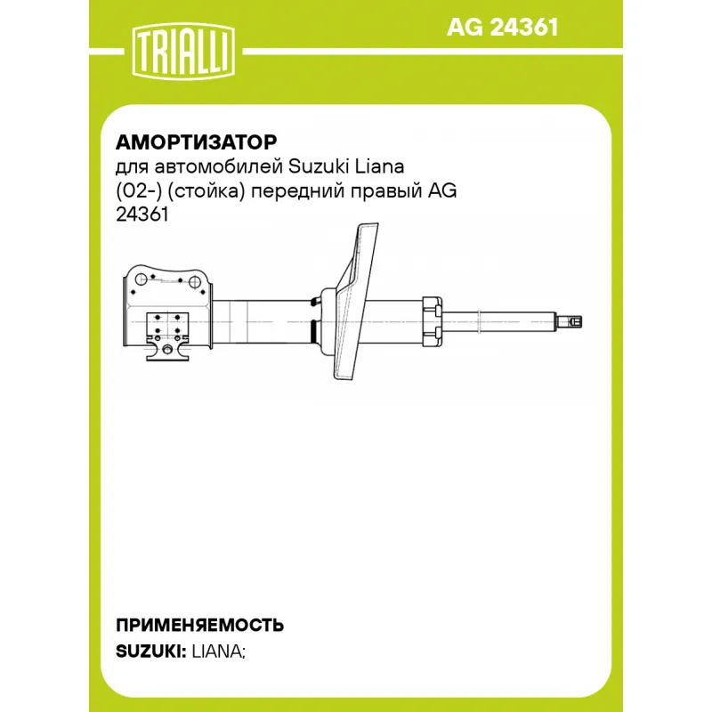 Амортизатор для автомобилей Suzuki Liana (02-) (стойка) передний правый Характеристики: Артикул: AG 24361 OEM номера: 4160154G50, 4160155G10, 4160155G50 Ход штока, мм: 166 Ось (сторона установки): Спереди, справа Тип амортизатора: Двухтрубный, гидравлический Вид амортизатора: Масляный с газовым подпором низкого давления Тип верхнего крепления: Шток Тип нижнего крепления: Скоба Диаметр корпуса, мм: 45 Диаметр штока, мм: 20 Размер резьбы штока: M12x1,25 Присоединительная длина 1, мм: 321 Присоединительная длина 2, мм: 487 Сопутствующий товар: Амортизаторы: AG 24160, AG 24200, AG 24400 Товарная линейка: BLACK Парный товар: AG 24160 Количество на автомобиль: 1 Дополнительная информация: Упаковка изделия может отличаться от представленной на фото Гарантийный срок: 2 года/60 000 км Комплектация: Амортизатор (стойка) передний - 1 шт Гайка крепежная - 1 шт Шайба - 1 шт Гарантия: от 1 года.