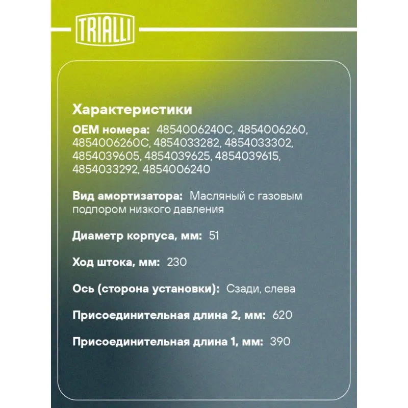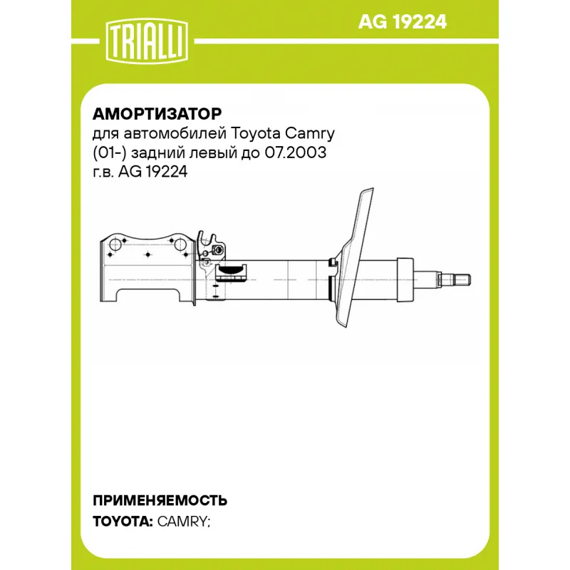 Амортизатор для автомобилей Toyota Camry (01-) задний левый до 07.2003 г.в. Характеристики: Артикул: AG 19224 OEM номера: 4854006240C, 4854006260, 4854006260C, 4854033282, 4854033302, 4854039605, 4854039625, 4854039615, 4854033292, 4854006240 Ход штока, мм: 230 Ось (сторона установки): Сзади, слева Тип амортизатора: Двухтрубный, гидравлический Вид амортизатора: Масляный с газовым подпором низкого давления Тип верхнего крепления: Шток Тип нижнего крепления: Скоба Диаметр корпуса, мм: 51 Диаметр штока, мм: 22 Размер резьбы штока: M14x1,5 Присоединительная длина 1, мм: 390 Присоединительная длина 2, мм: 620 Сопутствующий товар: Амортизаторы: AG 19425, AG 19188, AG 19387 Товарная линейка: BLACK Парный товар: AG 19425 Количество на автомобиль: 1 Дополнительная информация: Упаковка изделия может отличаться от представленной на фото Гарантийный срок: 2 года/60 000 км Комплектация: Гайка крепежная - 1 шт Амортизатор задний - 1 шт Гарантия: от 1 года.