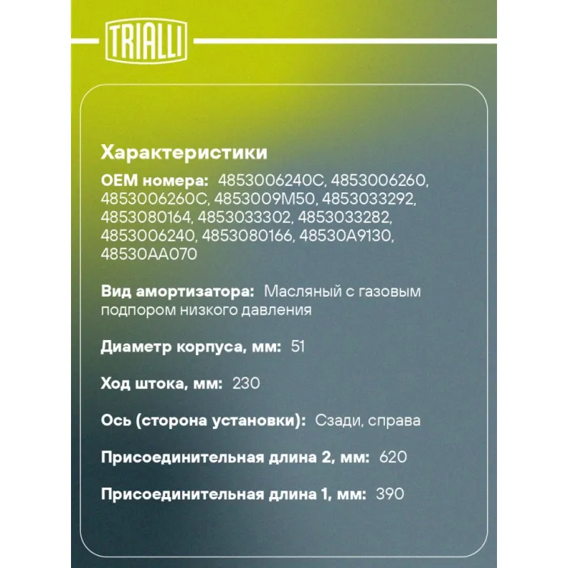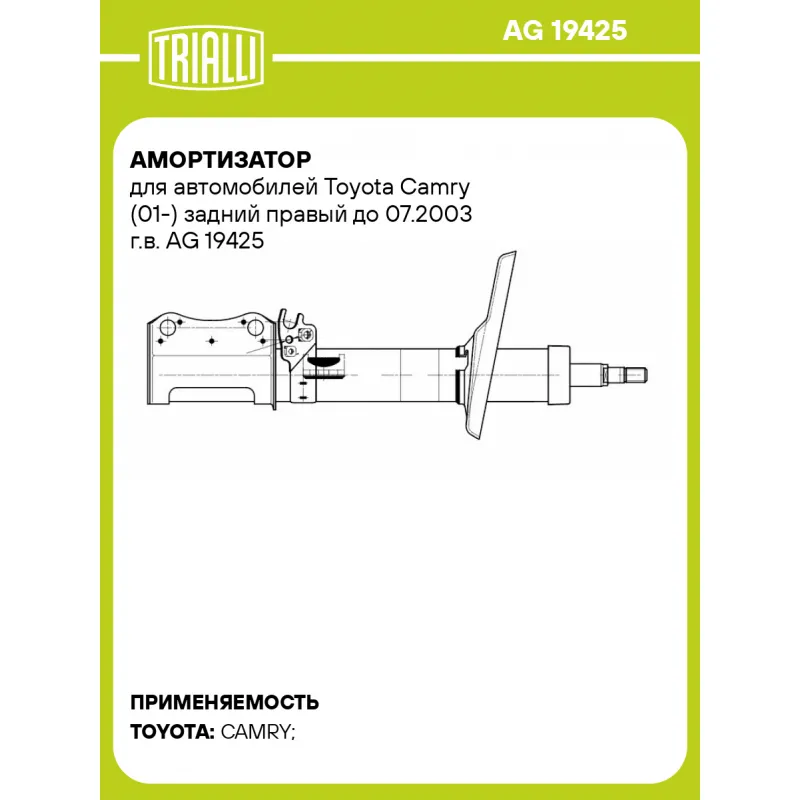 Амортизатор для автомобилей Toyota Camry (01-) задний правый до 07.2003 г.в. Характеристики: Артикул: AG 19425 OEM номера: 4853006240C, 4853006260, 4853006260C, 4853009M50, 4853033292, 4853080164, 4853033302, 4853033282, 4853006240, 4853080166, 48530A9130, 48530AA070, 48530AA040, 48530A9120, 4853080165 Ход штока, мм: 230 Ось (сторона установки): Сзади, справа Тип амортизатора: Двухтрубный, гидравлический Вид амортизатора: Масляный с газовым подпором низкого давления Тип верхнего крепления: Шток Тип нижнего крепления: Скоба Диаметр корпуса, мм: 51 Диаметр штока, мм: 22 Размер резьбы штока: M14x1,5 Присоединительная длина 1, мм: 390 Присоединительная длина 2, мм: 620 Сопутствующий товар: Амортизаторы: AG 19224, AG 19188, AG 19387 Товарная линейка: BLACK Парный товар: AG 19224 Количество на автомобиль: 1 Дополнительная информация: Упаковка изделия может отличаться от представленной на фото Гарантийный срок: 2 года/60 000 км Комплектация: Гайка крепежная - 1 шт Амортизатор задний - 1 шт Гарантия: от 1 года.
