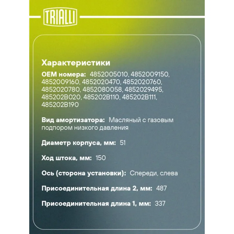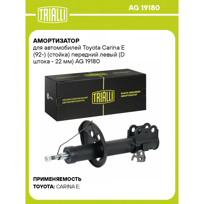 Амортизатор для автомобилей Toyota Carina E (92-) (стойка) передний левый (D штока - 22 мм) Описание: Амортизатор AG 19180 бренда TRIALLI – это устройство для гашения колебаний (демпфирования) и поглощения толчков и ударов, действующих на раму. Особенности AG 19180: - Вид – Масляный с газовым подпором низкого давления; - Тип – Двухтрубный, гидравлический; Для крепления к деталям кузова или подвески используются крепления: верхнее Шток M14x1,5; и нижнее Скоба. Амортизатор в машину (стойка) имеет специальную площадку для установки пружины подвески. Совместим с: TOYOTA CARINA E.Подбор по VIN-номеру вашего автомобиля - через кнопку 'Задать вопрос'. Специалист проверит применяемость и ответит вам. Преимущества: - Инновационная технология производства; - Контроль качества каждой позиции по чертежам и с помощью 3D модели; - Сальник NOK; - Высокоэффективная система проектирования; - Гарантия до двух лет или 60 000 км пробега; Амортизаторы автомобильные существенно влияют на комфорт вождения, сокращая вибрации от неровностей дороги, что делает поездку более плавной и приятной. Регулярное и своевременное обслуживание амортизаторов помогут продлить их срок службы и обеспечить надёжную работу. Характеристики: Артикул: AG 19180 OEM номера: 4852005010, 4852009150, 4852009160, 4852020470, 4852020760, 4852020780, 4852080058, 4852029495, 485202B020, 485202B110, 485202B111, 485202B190, 4852080032, 4852029285, 4852029286, 4852029287, 4852029345, 4852029346, 4852029385, 4852029185, 4852029186, 4852029188, 4852029215, 4852029216, 4852029275, 4852020840, 4852020880, 4852020881, 4852020882, 4852020890, 4852021100 Ход штока, мм: 150 Ось (сторона установки): Спереди, слева Тип амортизатора: Двухтрубный, гидравлический Вид амортизатора: Масляный с газовым подпором низкого давления Тип верхнего крепления: Шток Тип нижнего крепления: Скоба Диаметр корпуса, мм: 51 Диаметр штока, мм: 22 Размер резьбы штока: M14x1,5 Присоединительная длина 1, мм: 337 Присоединительная длина 2, мм: 487 Сопутствующий товар: Амортизаторы: AG 19379 Товарная линейка: BLACK Парный товар: AG 19379 Количество на автомобиль: 1 Дополнительная информация: Упаковка изделия может отличаться от представленной на фото Гарантийный срок: 2 года/60 000 км Комплектация: Амортизатор (стойка) передний - 1 шт Гайка крепежная - 1 шт Гарантия: от 1 года.