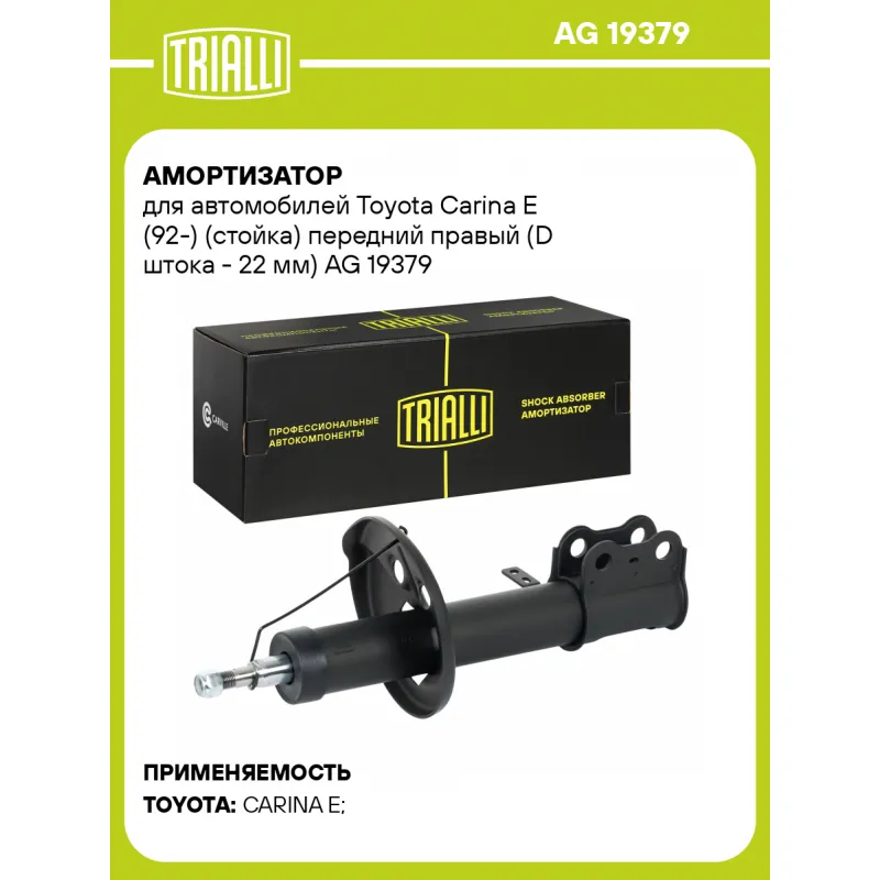 Амортизатор для автомобилей Toyota Carina E (92-) (стойка) передний правый (D штока - 22 мм) Описание: Амортизатор AG 19379 бренда TRIALLI – это устройство для гашения колебаний (демпфирования) и поглощения толчков и ударов, действующих на раму. Особенности AG 19379: - Вид – Масляный с газовым подпором низкого давления; - Тип – Двухтрубный, гидравлический; Для крепления к деталям кузова или подвески используются крепления: верхнее Шток M14x1,5; и нижнее Скоба. Амортизатор в машину (стойка) имеет специальную площадку для установки пружины подвески. Совместим с: TOYOTA CARINA E.Подбор по VIN-номеру вашего автомобиля - через кнопку 'Задать вопрос'. Специалист проверит применяемость и ответит вам. Преимущества: - Инновационная технология производства; - Контроль качества каждой позиции по чертежам и с помощью 3D модели; - Сальник NOK; - Высокоэффективная система проектирования; - Гарантия до двух лет или 60 000 км пробега; Амортизаторы автомобильные существенно влияют на комфорт вождения, сокращая вибрации от неровностей дороги, что делает поездку более плавной и приятной. Регулярное и своевременное обслуживание амортизаторов помогут продлить их срок службы и обеспечить надёжную работу. Характеристики: Артикул: AG 19379 OEM номера: 4851005010, 4851009150, 4851009160, 4851020470, 4851020760, 4851020780, 4851080199, 4851080240, 4851029675, 4851029785, 485102B020, 485102B110, 485102B111, 485102B190, 4851029465, 4851029475, 4851029476, 4851029477, 4851029635, 4851029636, 4851029277, 4851029375, 4851029376, 4851029378, 4851029405, 4851029406, 4851020840, 4851020880, 4851020881, 4851020882, 4851020890, 4851021100 Ход штока, мм: 150 Ось (сторона установки): Спереди, справа Тип амортизатора: Двухтрубный, гидравлический Вид амортизатора: Масляный с газовым подпором низкого давления Тип верхнего крепления: Шток Тип нижнего крепления: Скоба Диаметр корпуса, мм: 51 Диаметр штока, мм: 22 Размер резьбы штока: M14x1,5 Присоединительная длина 1, мм: 337 Присоединительная длина 2, мм: 487 Сопутствующий товар: Амортизаторы: AG 19180 Товарная линейка: BLACK Парный товар: AG 19180 Количество на автомобиль: 1 Дополнительная информация: Упаковка изделия может отличаться от представленной на фото Гарантийный срок: 2 года/60 000 км Комплектация: Амортизатор (стойка) передний - 1 шт Гайка крепежная - 1 шт Гарантия: от 1 года.