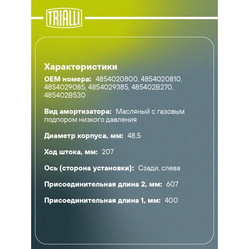 Амортизатор для автомобилей Toyota Carina E (92-) задний левый (усиленная подвеска) Описание: Амортизатор AG 19213 бренда TRIALLI – это устройство для гашения колебаний (демпфирования) и поглощения толчков и ударов, действующих на раму. Особенности AG 19213: - Вид – Масляный с газовым подпором низкого давления; - Тип – Двухтрубный, гидравлический; Для крепления к деталям кузова или подвески используются крепления: верхнее Шток M14x1,5; и нижнее Скоба. Совместим с: TOYOTA CARINA E.Подбор по VIN-номеру вашего автомобиля - через кнопку 'Задать вопрос'. Специалист проверит применяемость и ответит вам. Преимущества: - Инновационная технология производства; - Контроль качества каждой позиции по чертежам и с помощью 3D модели; - Сальник NOK; - Высокоэффективная система проектирования; - Гарантия до двух лет или 60 000 км пробега; Амортизаторы автомобильные существенно влияют на комфорт вождения, сокращая вибрации от неровностей дороги, что делает поездку более плавной и приятной. Регулярное и своевременное обслуживание амортизаторов помогут продлить их срок службы и обеспечить надёжную работу. Характеристики: Артикул: AG 19213 OEM номера: 4854020800, 4854020810, 4854029085, 4854029385, 485402B270, 485402B530 Ход штока, мм: 207 Ось (сторона установки): Сзади, слева Вид амортизатора: Масляный с газовым подпором низкого давления Тип верхнего крепления: Шток Тип нижнего крепления: Скоба Диаметр корпуса, мм: 48,5 Диаметр штока, мм: 20 Размер резьбы штока: M14x1,5 Присоединительная длина 1, мм: 400 Присоединительная длина 2, мм: 607 Товарная линейка: BLACK Парный товар: AG 19414 Количество на автомобиль: 1 Тип амортизатора: Двухтрубный, гидравлический Дополнительная информация: Упаковка изделия может отличаться от представленной на фото Сопутствующий товар: Амортизаторы: AG 19414 Гарантийный срок: 2 года/60 000 км Комплектация: Гайка крепежная - 1 шт Амортизатор задний - 1 шт Гарантия: от 1 года.