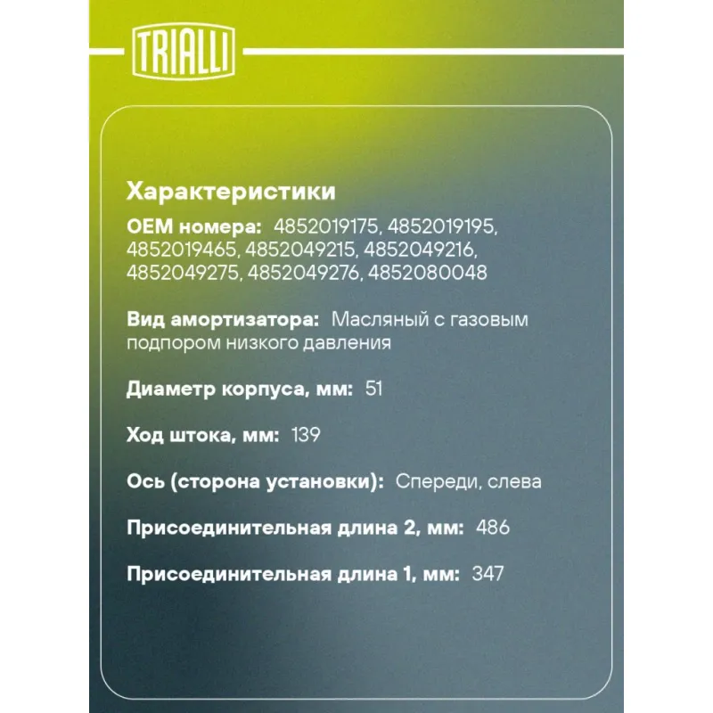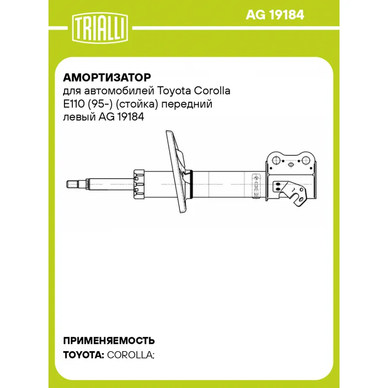 Амортизатор для автомобилей Toyota Corolla E110 (95-) (стойка) передний левый Характеристики: Артикул: AG 19184 OEM номера: 4852019175, 4852019195, 4852019465, 4852049215, 4852049216, 4852049275, 4852049276, 4852080048 Ход штока, мм: 139 Ось (сторона установки): Спереди, слева Тип амортизатора: Двухтрубный, гидравлический Вид амортизатора: Масляный с газовым подпором низкого давления Тип верхнего крепления: Шток Тип нижнего крепления: Скоба Диаметр корпуса, мм: 51 Диаметр штока, мм: 22 Размер резьбы штока: M14x1,5 Присоединительная длина 1, мм: 347 Присоединительная длина 2, мм: 486 Сопутствующий товар: Амортизаторы: AG 19383, AG 19219, AG 19420 Товарная линейка: BLACK Парный товар: AG 19383 Количество на автомобиль: 1 Дополнительная информация: Упаковка изделия может отличаться от представленной на фото Гарантийный срок: 2 года/60 000 км Комплектация: Амортизатор (стойка) передний - 1 шт Гайка крепежная - 1 шт Шайба - 1 шт Гарантия: от 1 года.