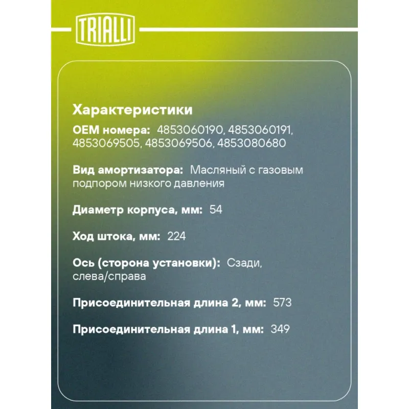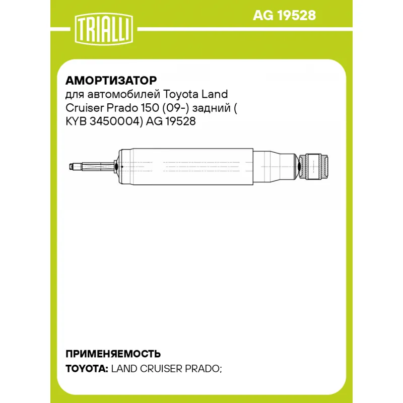 Амортизатор для автомобилей Toyota Land Cruiser Prado 150 (09-) задний (аналог KYB 3450004) Характеристики: Артикул: AG 19528 OEM номера: 4853060190, 4853060191, 4853069505, 4853069506, 4853080680 Ход штока, мм: 224 Ось (сторона установки): Сзади, слева/справа Тип амортизатора: Двухтрубный, гидравлический Вид амортизатора: Масляный с газовым подпором низкого давления Тип верхнего крепления: Шток Тип нижнего крепления: Проушина/сайлентблок Диаметр корпуса, мм: 54 Диаметр штока, мм: 15 Размер резьбы штока: M12x1,25 Присоединительная длина 1, мм: 349 Присоединительная длина 2, мм: 573 Сопутствующий товар: Амортизаторы: AG 19529, AG 19016 Товарная линейка: BLACK Количество на автомобиль: 2 Дополнительная информация: Упаковка изделия может отличаться от представленной на фото Гарантийный срок: 2 года/60 000 км Комплектация: Амортизатор задний - 1 шт Гайка крепежная - 1 шт Гарантия: от 1 года.