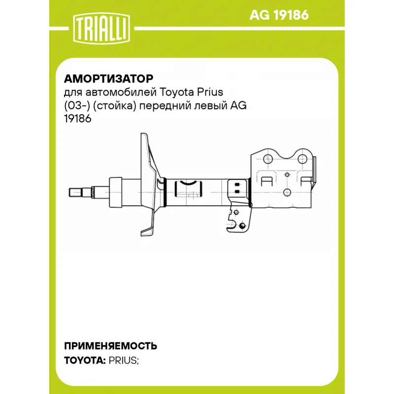 Амортизатор для автомобилей Toyota Prius (03-) (стойка) передний левый Характеристики: Артикул: AG 19186 OEM номера: 4852047040, 4852047041, 4852047050, 4852047070, 4852049575, 4852049585, 4852080064, 4852080081 Ход штока, мм: 180 Ось (сторона установки): Спереди, слева Тип амортизатора: Двухтрубный, гидравлический Вид амортизатора: Масляный с газовым подпором низкого давления Тип верхнего крепления: Шток Тип нижнего крепления: Скоба Диаметр корпуса, мм: 45 Диаметр штока, мм: 20 Размер резьбы штока: M14x1,5 Присоединительная длина 1, мм: 344 Присоединительная длина 2, мм: 524 Сопутствующий товар: Амортизаторы: AG 19385, AG 19527 Товарная линейка: BLACK Парный товар: AG 19385 Количество на автомобиль: 1 Дополнительная информация: Упаковка изделия может отличаться от представленной на фото Гарантийный срок: 2 года/60 000 км Комплектация: Амортизатор (стойка) передний - 1 шт Гайка крепежная - 1 шт Гарантия: от 1 года.