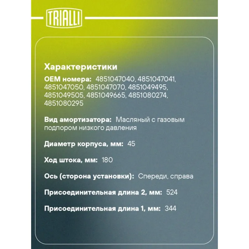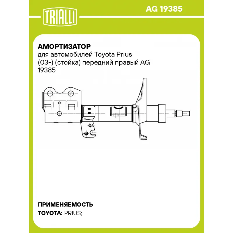 Амортизатор для автомобилей Toyota Prius (03-) (стойка) передний правый Характеристики: Артикул: AG 19385 OEM номера: 4851047040, 4851047041, 4851047050, 4851047070, 4851049495, 4851049505, 4851049665, 4851080274, 4851080295 Ход штока, мм: 180 Ось (сторона установки): Спереди, справа Тип амортизатора: Двухтрубный, гидравлический Вид амортизатора: Масляный с газовым подпором низкого давления Тип верхнего крепления: Шток Тип нижнего крепления: Скоба Диаметр корпуса, мм: 45 Диаметр штока, мм: 20 Размер резьбы штока: M14x1,5 Присоединительная длина 1, мм: 344 Присоединительная длина 2, мм: 524 Сопутствующий товар: Амортизаторы: AG 19186, AG 19527 Товарная линейка: BLACK Парный товар: AG 19186 Количество на автомобиль: 1 Дополнительная информация: Упаковка изделия может отличаться от представленной на фото Гарантийный срок: 2 года/60 000 км Комплектация: Амортизатор (стойка) передний - 1 шт Гайка крепежная - 1 шт Гарантия: от 1 года.