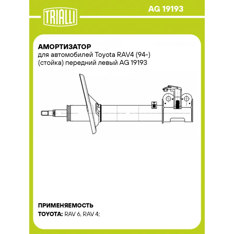 Амортизатор для автомобилей Toyota RAV4 (94-) (стойка) передний левый Характеристики: Артикул: AG 19193 OEM номера: 4852049026, 4852049027, 4852049016 Ход штока, мм: 183 Ось (сторона установки): Спереди, слева Тип амортизатора: Двухтрубный, гидравлический Вид амортизатора: Масляный с газовым подпором низкого давления Тип верхнего крепления: Шток Тип нижнего крепления: Скоба Диаметр корпуса, мм: 51 Диаметр штока, мм: 22 Размер резьбы штока: M14x1,5 Присоединительная длина 1, мм: 397 Присоединительная длина 2, мм: 580 Сопутствующий товар: Амортизаторы: AG 19393 Товарная линейка: BLACK Парный товар: AG 19393 Количество на автомобиль: 1 Дополнительная информация: Упаковка изделия может отличаться от представленной на фото Гарантийный срок: 2 года/60 000 км Комплектация: Амортизатор (стойка) передний - 1 шт Гайка крепежная - 1 шт Гарантия: от 1 года.