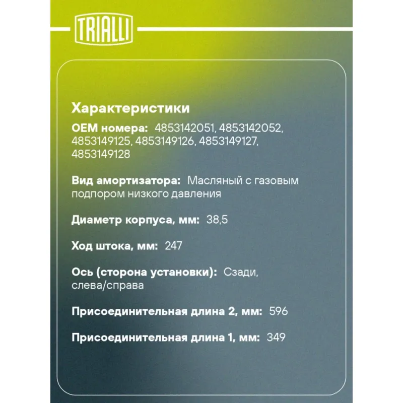 Амортизатор для автомобилей Toyota RAV4 (94-) задний Характеристики: Артикул: AG 19532 OEM номера: 4853142051, 4853142052, 4853149125, 4853149126, 4853149127, 4853149128 Ход штока, мм: 247 Ось (сторона установки): Сзади, слева/справа Тип амортизатора: Двухтрубный, гидравлический Вид амортизатора: Масляный с газовым подпором низкого давления Тип верхнего крепления: Шток Тип нижнего крепления: Проушина/сайлентблок Диаметр корпуса, мм: 38,5 Диаметр штока, мм: 12,5 Размер резьбы штока: M10x1,25 Присоединительная длина 1, мм: 349 Присоединительная длина 2, мм: 596 Товарная линейка: BLACK Количество на автомобиль: 2 Дополнительная информация: Упаковка изделия может отличаться от представленной на фото Гарантийный срок: 2 года/60 000 км Комплектация: Амортизатор задний - 1 шт Гайка крепежная - 2 шт Шайба - 3 шт Подушка резиновая - 2 шт Гарантия: от 1 года.