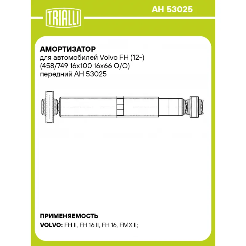 Амортизатор для автомобилей Volvo FH (12-) (458/749 16x100 16x66 O/O) передний Характеристики: Артикул: AH 53025 OEM номера: 21172372, 21866530, 23960708 Ход штока, мм: 291 Ось (сторона установки): Спереди, слева/справа Тип амортизатора: Двухтрубный, гидравлический Вид амортизатора: Масляный Тип верхнего крепления: Проушина/сайлентблок Тип нижнего крепления: Проушина/сайлентблок Диаметр корпуса, мм: 54 Диаметр штока, мм: 15 Присоединительная длина 1, мм: 458 Присоединительная длина 2, мм: 749 Сопутствующий товар: Амортизаторы: AH 53513 Товарная линейка: BLACK Количество на автомобиль: 2 Дополнительная информация: Упаковка изделия может отличаться от представленной на фото Гарантийный срок: 2 года/60 000 км Комплектация: Амортизатор передний - 1 шт Гарантия: от 1 года.