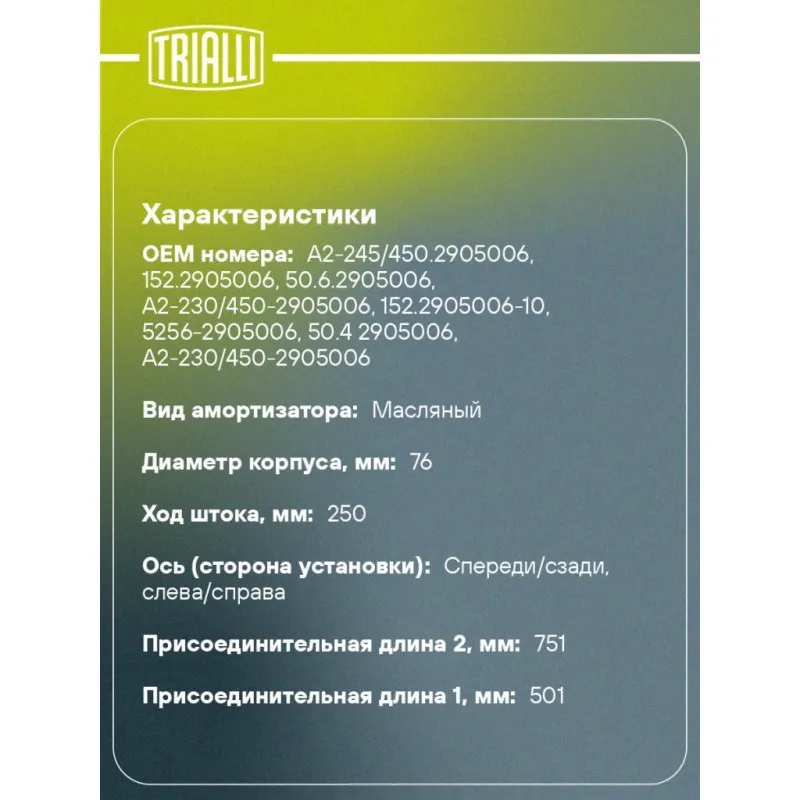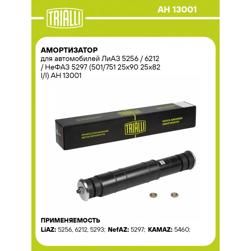 Амортизатор для автомобилей ЛиАЗ 5256 / 6212 / НеФАЗ 5297 (501/751 25х90 25х82 I/I) Описание: Амортизатор AH 13001 бренда TRIALLI – это устройство для гашения колебаний (демпфирования) и поглощения толчков и ударов, действующих на раму. Особенности AH 13001: - Вид – Масляный; - Тип – Двухтрубный, гидравлический; Для крепления к деталям кузова или подвески используются крепления: верхнее Корпус/палец ; и нижнее Шток. Совместим с: KAMAZ 5460, LIAZ BUS 5293, 5256, 6212, LiAZ 6212, 5293, NEFAZ 5297.Подбор по VIN-номеру вашего автомобиля - через кнопку 'Задать вопрос'. Специалист проверит применяемость и ответит вам. Преимущества: - Инновационная технология производства; - Контроль качества каждой позиции по чертежам и с помощью 3D модели; - Сальник NOK; - Высокоэффективная система проектирования; - Гарантия до двух лет или 60 000 км пробега; Амортизаторы автомобильные существенно влияют на комфорт вождения, сокращая вибрации от неровностей дороги, что делает поездку более плавной и приятной. Регулярное и своевременное обслуживание амортизаторов помогут продлить их срок службы и обеспечить надёжную работу. Характеристики: Артикул: AH 13001 OEM номера: А2-245/450.2905006, 152.2905006, 50.6.2905006, А2-230/450-2905006, 152.2905006-10, 5256-2905006, 50.4 2905006, A2-230/450-2905006, A2-245/450.2905006, 50.4.2905005 Товарная линейка: BLACK Количество на автомобиль: 4 Вид амортизатора: Масляный Тип верхнего крепления: Корпус/палец Тип нижнего крепления: Шток Диаметр корпуса, мм: 76 Диаметр штока, мм: 20 Ход штока, мм: 250 Тип амортизатора: Двухтрубный, гидравлический Ось (сторона установки): Спереди/сзади, слева/справа Дополнительная информация: Применяется в а/м КАМАЗ 5460 с пневмоподвеской устаревшей конструкции Присоединительная длина 2, мм: 751 Присоединительная длина 1, мм: 501 Гарантийный срок: 2 года/60 000 км Подходит для авто: ЛиАЗ 5256, 6212, 5293 NefAZ 5297 КамаАЗ 5460, 5460 Для проверки применяемости отправьте VIN автомобиля через вкладку "Есть вопросы о товаре?" Комплектация: Подушка резиновая - 4 шт Амортизатор передний/задний - 1 шт Шайба - 2 шт Гайка крепежная - 2 шт Контргайка - 2 шт Колпачок защитный - 2 шт Гарантия: от 1 года.