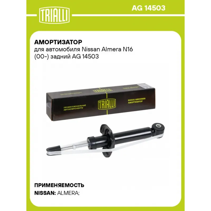 Амортизатор для автомобиля Nissan Almera N16 (00-) задний Характеристики: Артикул: AG 14503 OEM номера: 56210BM400, 56210BM410, 56210BM425, 56210BM426, 56210BM427, 56210BN825 Ход штока, мм: 131 Ось (сторона установки): Сзади, слева/справа Тип амортизатора: Двухтрубный, гидравлический Вид амортизатора: Масляный с газовым подпором низкого давления Тип верхнего крепления: Шток Тип нижнего крепления: Проушина/сайлентблок Диаметр корпуса, мм: 38 Диаметр штока, мм: 12,4 Размер резьбы штока: M10x1,25 Присоединительная длина 1, мм: 258 Присоединительная длина 2, мм: 389 Сопутствующий товар: Амортизаторы: AG 14504 Товарная линейка: BLACK Количество на автомобиль: 2 Дополнительная информация: Упаковка изделия может отличаться от представленной на фото Гарантийный срок: 2 года/60 000 км Комплектация: Амортизатор задний - 1 шт Гайка крепежная - 1 шт Гарантия: от 1 года.