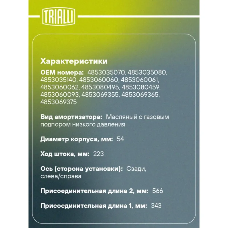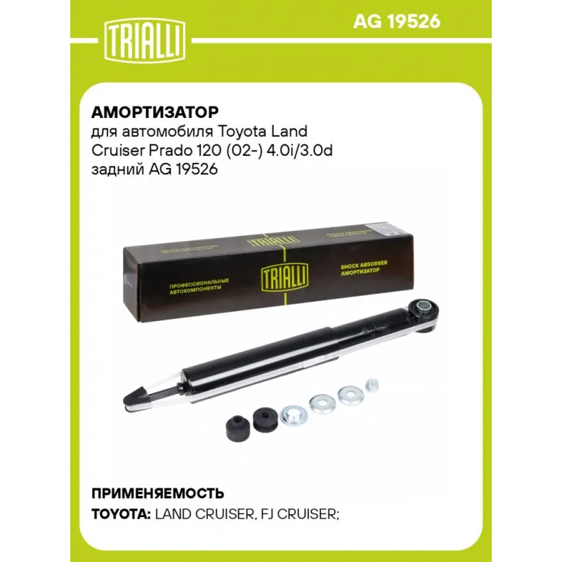 Амортизатор для автомобиля Toyota Land Cruiser Prado 120 (02-) 4.0i/3.0d задний Характеристики: Артикул: AG 19526 OEM номера: 4853035070, 4853035080, 4853035140, 4853060060, 4853060061, 4853060062, 4853080495, 4853080459, 4853060093, 4853069355, 4853069365, 4853069375, 4853069385, 4853080087, 4853080088, 4853060090, 4853060091, 4853060092, 4853069165, 4853069195, 4853069335 Ход штока, мм: 223 Ось (сторона установки): Сзади, слева/справа Тип амортизатора: Двухтрубный, гидравлический Вид амортизатора: Масляный с газовым подпором низкого давления Тип верхнего крепления: Шток Тип нижнего крепления: Проушина/сайлентблок Диаметр корпуса, мм: 54 Диаметр штока, мм: 12 Размер резьбы штока: M12x1,25 Присоединительная длина 1, мм: 343 Присоединительная длина 2, мм: 566 Товарная линейка: BLACK Количество на автомобиль: 2 Дополнительная информация: Упаковка изделия может отличаться от представленной на фото Гарантийный срок: 2 года/60 000 км Комплектация: Амортизатор задний - 1 шт Шайба - 3 шт Гайка крепежная - 1 шт Подушка резиновая - 2 шт Гарантия: от 1 года.