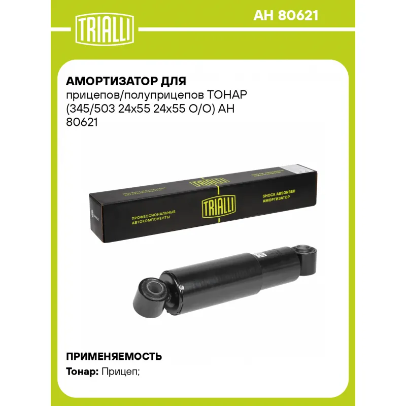 Амортизатор для прицепов/полуприцепов ТОНАР (345/503 24х55 24х55 О/О) Описание: Амортизатор AH 80621 бренда TRIALLI – это устройство для гашения колебаний (демпфирования) и поглощения толчков и ударов, действующих на раму. Особенности AH 80621: - Вид – Масляный; - Тип – Двухтрубный, гидравлический; Для крепления к деталям кузова или подвески используются крепления: верхнее Проушина/сайлентблок ; и нижнее Проушина/сайлентблок. Совместим с: Тонар Прицеп.Подбор по VIN-номеру вашего автомобиля - через кнопку 'Задать вопрос'. Специалист проверит применяемость и ответит вам. Преимущества: - Инновационная технология производства; - Контроль качества каждой позиции по чертежам и с помощью 3D модели; - Сальник NOK; - Высокоэффективная система проектирования; - Гарантия до двух лет или 60 000 км пробега; Амортизаторы автомобильные существенно влияют на комфорт вождения, сокращая вибрации от неровностей дороги, что делает поездку более плавной и приятной. Регулярное и своевременное обслуживание амортизаторов помогут продлить их срок службы и обеспечить надёжную работу. Характеристики: Артикул: AH 80621 OEM номера: 4542054238, П50.1.2905005 Товарная линейка: BLACK Количество на автомобиль: 2 Вид амортизатора: Масляный Тип верхнего крепления: Проушина/сайлентблок Тип нижнего крепления: Проушина/сайлентблок Диаметр корпуса, мм: 70 Диаметр штока, мм: 22 Ход штока, мм: 160 Тип амортизатора: Двухтрубный, гидравлический Ось (сторона установки): Сзади, слева/справа Дополнительная информация: Упаковка изделия может отличаться от представленной на фото Присоединительная длина 2, мм: 504 Присоединительная длина 1, мм: 344 Гарантийный срок: 2 года/60 000 км Подходит для авто: Тонар Прицеп Для проверки применяемости отправьте VIN автомобиля через вкладку "Есть вопросы о товаре?" Комплектация: Амортизатор задний - 1 шт Шарнир резинометаллический - 2 шт Гарантия: от 1 года.