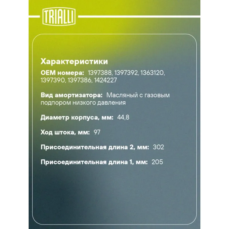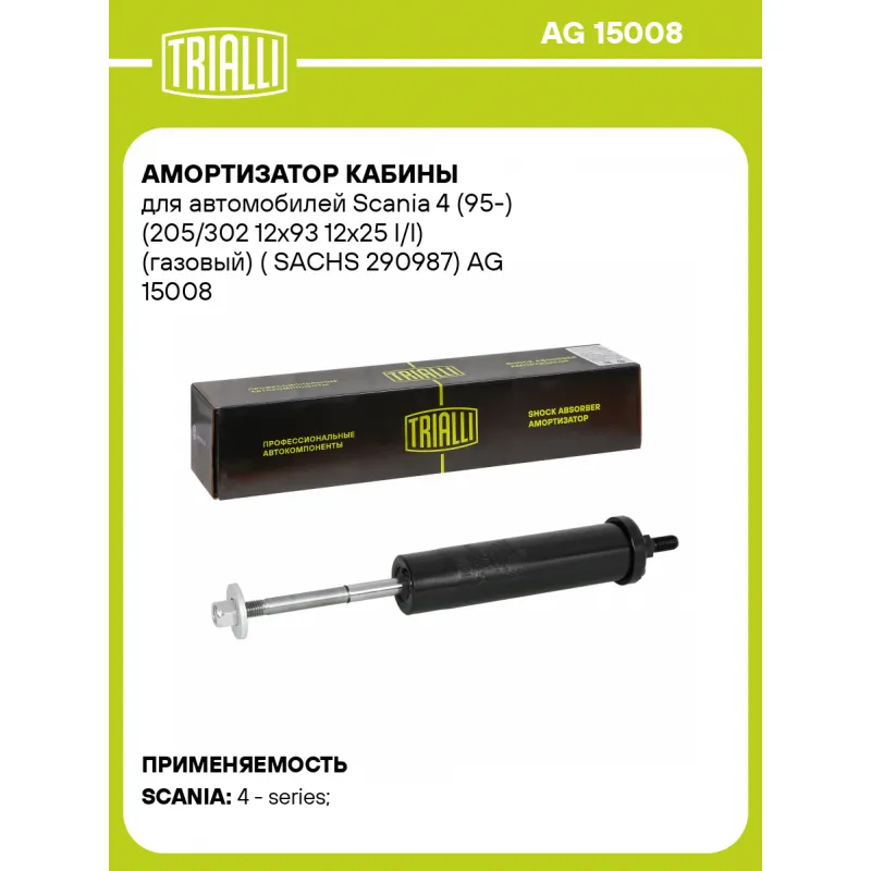 Амортизатор кабины для автомобилей Scania 4 (95-) (205/302 12x93 12x25 I/I) (газовый) (аналог SACHS 290987) Описание: Амортизатор AG 15008 бренда TRIALLI – это устройство для гашения колебаний (демпфирования) и поглощения толчков и ударов, действующих на раму. Особенности AG 15008: - Вид – Масляный с газовым подпором низкого давления; - Тип – Двухтрубный, гидравлический; Для крепления к деталям кузова или подвески используются крепления: верхнее Шток M12x1,75; и нижнее Корпус/палец. Совместим с: SCANIA 4-SERIES.Подбор по VIN-номеру вашего автомобиля - через кнопку 'Задать вопрос'. Специалист проверит применяемость и ответит вам. Преимущества: - Инновационная технология производства; - Контроль качества каждой позиции по чертежам и с помощью 3D модели; - Сальник NOK; - Высокоэффективная система проектирования; - Гарантия до двух лет или 60 000 км пробега; Амортизаторы автомобильные существенно влияют на комфорт вождения, сокращая вибрации от неровностей дороги, что делает поездку более плавной и приятной. Регулярное и своевременное обслуживание амортизаторов помогут продлить их срок службы и обеспечить надёжную работу. Характеристики: Артикул: AG 15008 OEM номера: 1397388, 1397392, 1363120, 1397390, 1397386, 1424227 Ход штока, мм: 97 Тип амортизатора: Двухтрубный, гидравлический Вид амортизатора: Масляный с газовым подпором низкого давления Тип верхнего крепления: Шток Тип нижнего крепления: Корпус/палец Диаметр корпуса, мм: 44,8 Диаметр штока, мм: 12,4 Размер резьбы штока: M12x1,75 Гарантийный срок: 2 года/60 000 км Присоединительная длина 1, мм: 205 Присоединительная длина 2, мм: 302 Товарная линейка: BLACK Максимальные усилия при ходе сжатия Н (кгс): 890 Максимальные усилия при ходе отбоя Н (кгс): 1830 Комплектация: Амортизатор кабины - 1 шт Гайка крепежная - 1 шт Гарантия: от 1 года.