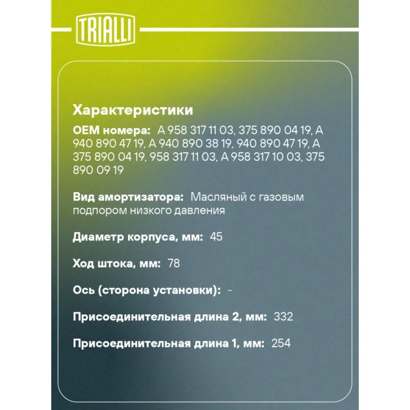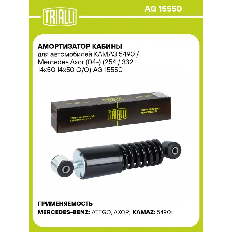 Амортизатор кабины для автомобилей КАМАЗ 5490 / Mercedes Axor (04-) (254 / 332 14х50 14х50 О/О) Описание: Амортизатор AG 15550 бренда TRIALLI – это устройство для гашения колебаний (демпфирования) и поглощения толчков и ударов, действующих на раму. Особенности AG 15550: - Вид – Масляный с газовым подпором низкого давления; - Тип – Двухтрубный, гидравлический; Для крепления к деталям кузова или подвески используются крепления: верхнее Проушина/сайлентблок ; и нижнее Проушина/сайлентблок. Совместим с: KAMAZ 5490, MERCEDES-BENZ ATEGO, AXOR.Подбор по VIN-номеру вашего автомобиля - через кнопку 'Задать вопрос'. Специалист проверит применяемость и ответит вам. Преимущества: - Инновационная технология производства; - Контроль качества каждой позиции по чертежам и с помощью 3D модели; - Сальник NOK; - Высокоэффективная система проектирования; - Гарантия до двух лет или 60 000 км пробега; Амортизаторы автомобильные существенно влияют на комфорт вождения, сокращая вибрации от неровностей дороги, что делает поездку более плавной и приятной. Регулярное и своевременное обслуживание амортизаторов помогут продлить их срок службы и обеспечить надёжную работу. Характеристики: Артикул: AG 15550 OEM номера: A 958 317 11 03, 375 890 04 19, A 940 890 47 19, A 940 890 38 19, 940 890 47 19, A 375 890 04 19, 958 317 11 03, A 958 317 10 03, 375 890 09 19, 940 890 38 19, A 375 890 09 19, 958 317 10 03 Гарантийный срок: 2 года/60 000 км Товарная линейка: BLACK Максимальные усилия при ходе сжатия Н (кгс): 844 Максимальные усилия при ходе отбоя Н (кгс): 1973 Вид амортизатора: Масляный с газовым подпором низкого давления Тип верхнего крепления: Проушина/сайлентблок Тип нижнего крепления: Проушина/сайлентблок Диаметр корпуса, мм: 45 Диаметр штока, мм: 15 Ход штока, мм: 78 Тип амортизатора: Двухтрубный, гидравлический Ось (сторона установки): - Присоединительная длина 2, мм: 332 Присоединительная длина 1, мм: 254 Комплектация: Амортизатор кабины - 1 шт Гарантия: от 1 года.