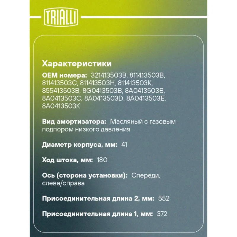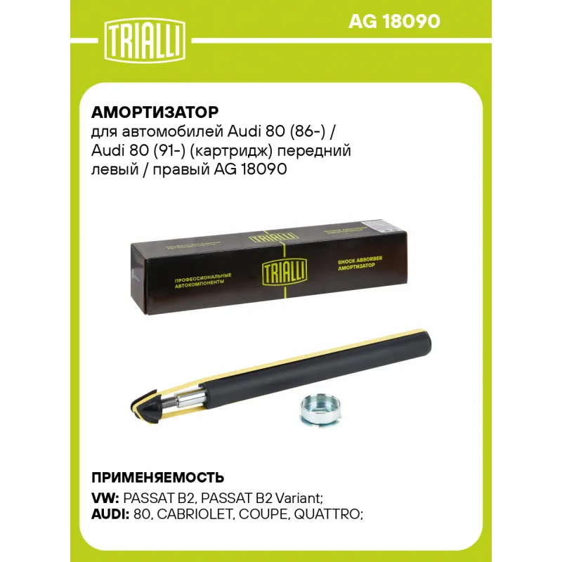 Амортизатор для автомобилей Audi 80 (86-) / Audi 80 (91-) (картридж) передний левый / правый Описание: Амортизатор AG 18090 бренда TRIALLI – это устройство для гашения колебаний (демпфирования) и поглощения толчков и ударов, действующих на раму. Особенности AG 18090: - Вид – Масляный с газовым подпором низкого давления; - Тип – Двухтрубный, гидравлический; Для крепления к деталям кузова или подвески используются крепления: верхнее Шток M14x1,5. Амортизатор в машину (картридж) – является обычным двухтрубным амортизатором, без каких либо дополнительных элементов крепления, входит в состав амортизатора (стойки). Совместим с: AUDI 80, CABRIOLET, COUPE, QUATTRO, VW PASSAT, SANTANA.Подбор по VIN-номеру вашего автомобиля - через кнопку 'Задать вопрос'. Специалист проверит применяемость и ответит вам. Преимущества: - Инновационная технология производства; - Контроль качества каждой позиции по чертежам и с помощью 3D модели; - Сальник NOK; - Высокоэффективная система проектирования; - Гарантия до двух лет или 60 000 км пробега; Амортизаторы автомобильные существенно влияют на комфорт вождения, сокращая вибрации от неровностей дороги, что делает поездку более плавной и приятной. Характеристики: Артикул: AG 18090 OEM номера: 321413503B, 811413503B, 811413503C, 811413503H, 811413503K, 855413503B, 8G0413503B, 8A0413503B, 8A0413503C, 8A0413503D, 8A0413503E, 8A0413503K, 8G0413503, 893413503M, 893413503P, 893413503Q, 893413503S, 895413503E, 8A0413503, 855413503C, 893413503AA, 893413503C, 893413503D, 893413503E, 893413503F Товарная линейка: BLACK Количество на автомобиль: 2 Вид амортизатора: Масляный с газовым подпором низкого давления Тип верхнего крепления: Шток Тип нижнего крепления: Зажим Диаметр корпуса, мм: 41 Диаметр штока, мм: 22 Ход штока, мм: 180 Размер резьбы штока: M14x1,5 Тип амортизатора: Двухтрубный, гидравлический Ось (сторона установки): Спереди, слева/справа Дополнительная информация: Упаковка изделия может отличаться от представленной на фото Присоединительная длина 2, мм: 552 Присоединительная длина 1, мм: 372 Гарантийный срок: 2 года/60 000 км Комплектация: Амортизатор передний - 1 шт Гайка крепежная - 1 шт Гарантия: от 1 года.