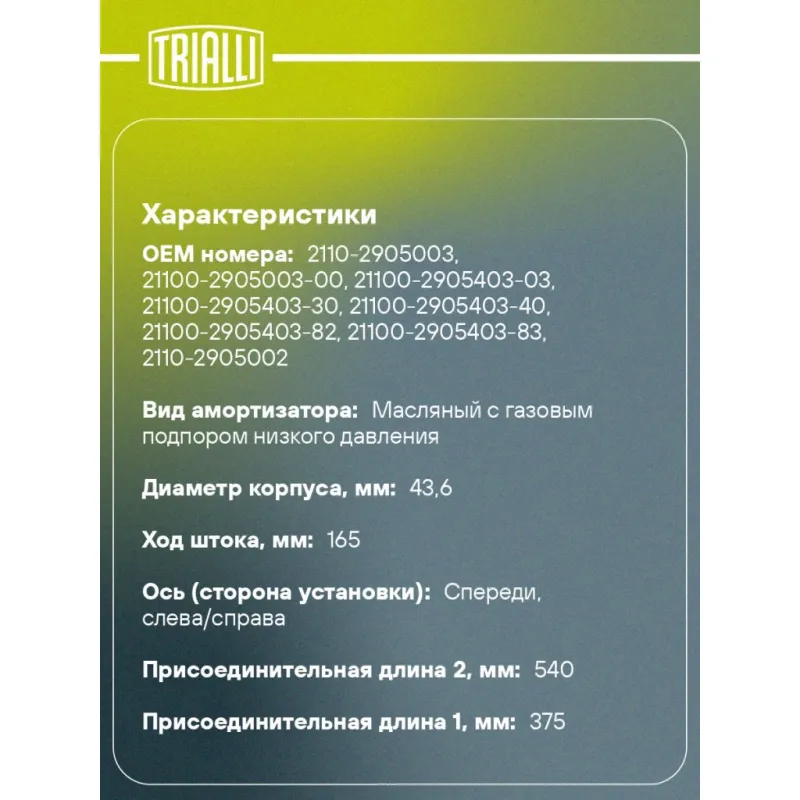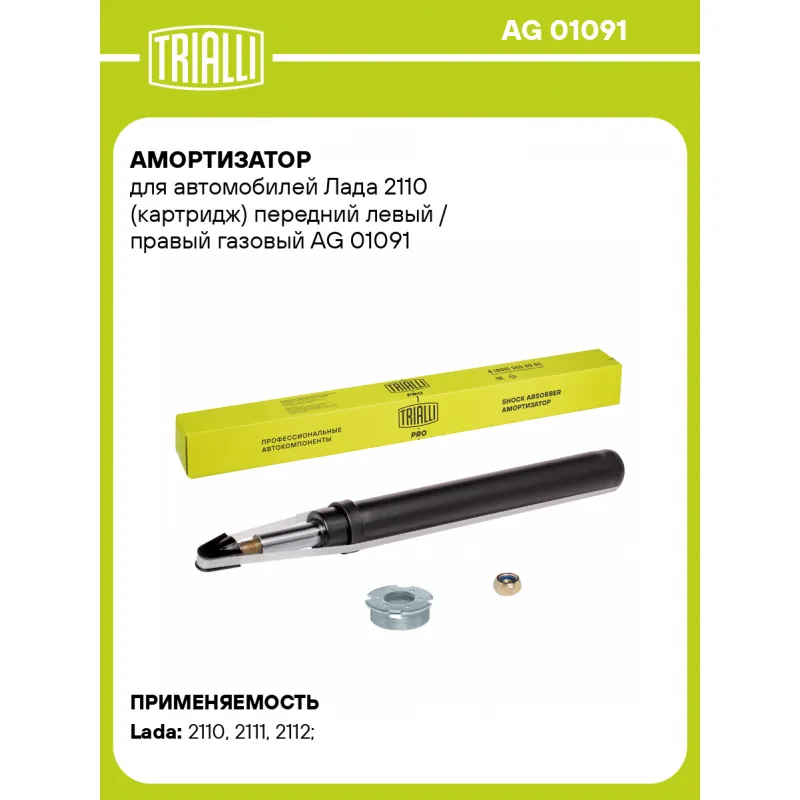Амортизатор для автомобилей Лада 2110 (картридж) передний левый / правый газовый Описание: Амортизатор AG 01091 бренда TRIALLI – это устройство для гашения колебаний (демпфирования) и поглощения толчков и ударов, действующих на раму. Особенности AG 01091: - Вид – Масляный с газовым подпором низкого давления; - Тип – Двухтрубный, гидравлический; Для крепления к деталям кузова или подвески используются крепления: верхнее Шток M14x1.5. Амортизатор в машину (картридж) – является обычным двухтрубным амортизатором, без каких либо дополнительных элементов крепления, входит в состав амортизатора (стойки). Совместим с: LADA ВАЗ 2110-2112.Подбор по VIN-номеру вашего автомобиля - через кнопку 'Задать вопрос'. Специалист проверит применяемость и ответит вам. Преимущества: - Инновационная технология производства; - Контроль качества каждой позиции по чертежам и с помощью 3D модели; - Сальник NOK; - Высокоэффективная система проектирования; - Гарантия до двух лет или 60 000 км пробега; Амортизаторы автомобильные существенно влияют на комфорт вождения, сокращая вибрации от неровностей дороги, что делает поездку более плавной и приятной. Характеристики: Артикул: AG 01091 OEM номера: 2110-2905003, 21100-2905003-00, 21100-2905403-03, 21100-2905403-30, 21100-2905403-40, 21100-2905403-82, 21100-2905403-83, 2110-2905002, 21100-2905002-00, 21100-2905002-02, 21100-2905003-02, 21100-2905402-03, 21100-2905402-30, 21100-2905402-40, 21100-2905402-82, 21100-2905402-83 Товарная линейка: PRO Количество на автомобиль: 2 Вид амортизатора: Масляный с газовым подпором низкого давления Тип верхнего крепления: Шток Диаметр корпуса, мм: 43,6 Диаметр штока, мм: 22 Ход штока, мм: 165 Размер резьбы штока: M14x1.5 Тип амортизатора: Двухтрубный, гидравлический Ось (сторона установки): Спереди, слева/справа Присоединительная длина 2, мм: 540 Сопутствующий товар: Опоры передних стоек: SA 0152 Присоединительная длина 1, мм: 375 Сопутствующий товар: Ремонтные комплекты амортизаторов: BC 0102, BC 0132, BC 0110, BCS 0102, BCS 0132, BC 1948, BCS 2048,BC 0152, BC 0182 Сопутствующий товар: Амортизаторы: AH 01091,AG 01379, AG 01153, AH 01379, AH 01504, AG 01504, AH 01178, AG 01354, AH 01153, AH 01354, AG 01178 Гарантийный срок: 2 года/60 000 км Подходит для авто: ВАЗ 2110, 2110, 2111, 2112, 2111, 2112 Для проверки применяемости отправьте VIN автомобиля через вкладку "Есть вопросы о товаре?" Комплектация: Амортизатор (картридж) передний - 1 шт Гайка крепежная - 1 шт Гайка стопорная - 1 шт Гарантия: от 1 года.