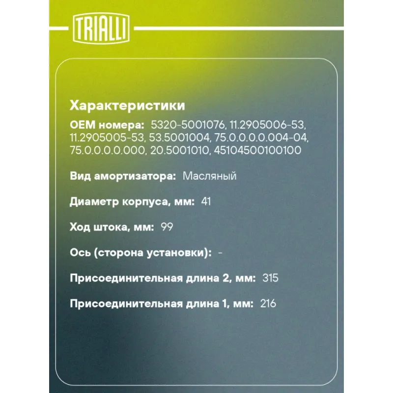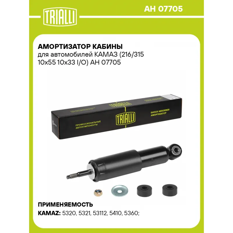 Амортизатор кабины для автомобилей КАМАЗ (216/315 10х55 10х33 I/О) Описание: Амортизатор AH 07705 бренда TRIALLI – это устройство для гашения колебаний (демпфирования) и поглощения толчков и ударов, действующих на раму. Особенности AH 07705: - Вид – Масляный; - Тип – Двухтрубный, гидравлический; Для крепления к деталям кузова или подвески используются крепления: верхнее Шток M10x1.25; и нижнее Проушина/сайлентблок. Совместим с: KAMAZ 4308, 43114, 43118, 43255, 4326, 43261, 44108, 45141, 4911, 5308, 53205, 53215, 53228, 53229, 5360, 53605, 54115, 5460, 5480, 55111, 63501, 6450, 6460, 65111, 65115, 65116, 65117, 6520, 65201, 6522, 65224, 65225, 65226, 65228, 6540, 6560, 5320, 53212, 4310, 5410, 53213, 54112, 5315, 5321, 53112.Подбор по VIN-номеру вашего автомобиля - через кнопку 'Задать вопрос'. Специалист проверит применяемость и ответит вам. Преимущества: - Инновационная технология производства; - Контроль качества каждой позиции по чертежам и с помощью 3D модели; - Сальник NOK; - Высокоэффективная система проектирования; - Гарантия до двух лет или 60 000 км пробега; Амортизаторы автомобильные существенно влияют на комфорт вождения, сокращая вибрации от неровностей дороги, что делает поездку более плавной и приятной. Регулярное и своевременное обслуживание амортизаторов помогут продлить их срок службы и обеспечить надёжную работу. Характеристики: Артикул: AH 07705 OEM номера: 5320-5001076, 11.2905006-53, 11.2905005-53, 53.5001004, 75.0.0.0.0.004-04, 75.0.0.0.0.000, 20.5001010, 45104500100100 Товарная линейка: BLACK Максимальные усилия при ходе сжатия Н (кгс): 300 Максимальные усилия при ходе отбоя Н (кгс): 1370 Вид амортизатора: Масляный Тип верхнего крепления: Шток Тип нижнего крепления: Проушина/сайлентблок Диаметр корпуса, мм: 41 Диаметр штока, мм: 12,5 Ход штока, мм: 99 Размер резьбы штока: M10x1.25 Тип амортизатора: Двухтрубный, гидравлический Ось (сторона установки): - Присоединительная длина 2, мм: 315 Присоединительная длина 1, мм: 216 Сопутствующий товар: Амортизаторы: AH 07002; AH 07003; AH 07504; AH 07506; AH 07507 Гарантийный срок: 2 года/60 000 км Подходит для авто: КамаАЗ 5320, 5321, 53112, 5410, 5360, 5460, 6520, 6522, 6540, 4310, 5315, 5315, 5320, 5320, 5320, 5321, 5410, 54112, 5360, 5460, 6460, 6520, 6520, 6520, 6522, 6522, 6522, 6540, 6540 Для проверки применяемости отправьте VIN автомобиля через вкладку "Есть вопросы о товаре?" Комплектация: Подушка резиновая - 1 шт Гайка крепежная - 1 шт Амортизатор кабины - 1 шт Шарнир резинометаллический - 1 шт Шайба металлическая - 1 шт Гарантия: от 1 года.