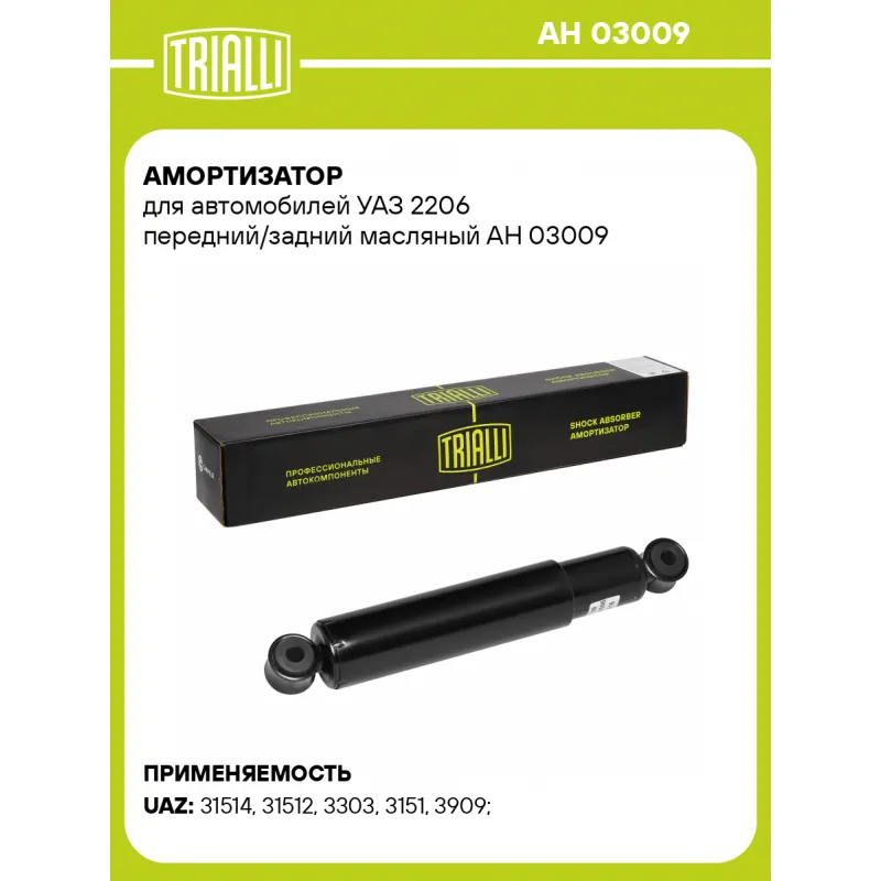 Амортизатор для автомобилей УАЗ 2206 передний/задний масляный Описание: Амортизатор бренда TRIALLI служит для гашения колебаний (демпфирования) и поглощения толчков и ударов, действующих на кузов (раму) автомобиля. Особенности: - Вид – Масляный; - Тип – Двухтрубный, гидравлический; Для крепления к деталям кузова автомобиля или подвески используется - верхнее крепление Проушина/втулка ; и нижнее крепление - Проушина/втулка. Применяемость: UAZ 2206, 452, 3303, 3909, 3151, HUNTER..Подбор по VIN-номеру вашего автомобиля - через кнопку 'Задать вопрос'. Специалист проверит применяемость и ответит вам. Преимущества: - Инновационная технология производства; - Контроль качества: - Дополнительная проверка с помощью 3D модели; - Сальник NOK; - Проверка каждой позиции по чертежам; - Высокоэффективная система проектирования; Амортизаторы автомобильные существенно влияют на комфорт вождения, поглощая удары и вибрации от неровностей дороги, что делает поездку более плавной и приятной.Регулярная проверка и своевременное обслуживание амортизаторов помогут продлить их срок службы и обеспечить надёжную работу. Характеристики: Артикул: AH 03009 OEM номера: 3151-2905006, 31512-2915404 Товарная линейка: BLACK Количество на автомобиль: 2 Вид амортизатора: Масляный Тип верхнего крепления: Проушина/втулка Тип нижнего крепления: Проушина/втулка Диаметр корпуса, мм: 51 Диаметр штока, мм: 15 Ход штока, мм: 201 Тип амортизатора: Двухтрубный, гидравлический Ось (сторона установки): Спереди/сзади, слева/справа Дополнительная информация: Упаковка изделия может отличаться от представленной на фото Присоединительная длина 2, мм: 548 Присоединительная длина 1, мм: 347 Сопутствующий товар: Амортизаторы: AG 03009 Гарантийный срок: 2 года/60 000 км Подходит для авто: УАЗ 31514, 31512, 3303, 3303, 3303, 3151 (85-), 3909, 3909, 2206, 3303, 3151 (85-), 3909 Для проверки применяемости отправьте VIN автомобиля через вкладку "Есть вопросы о товаре?" Комплектация: Амортизатор - 1 шт Втулка резиновая - 2 шт Гарантия: от 1 года.