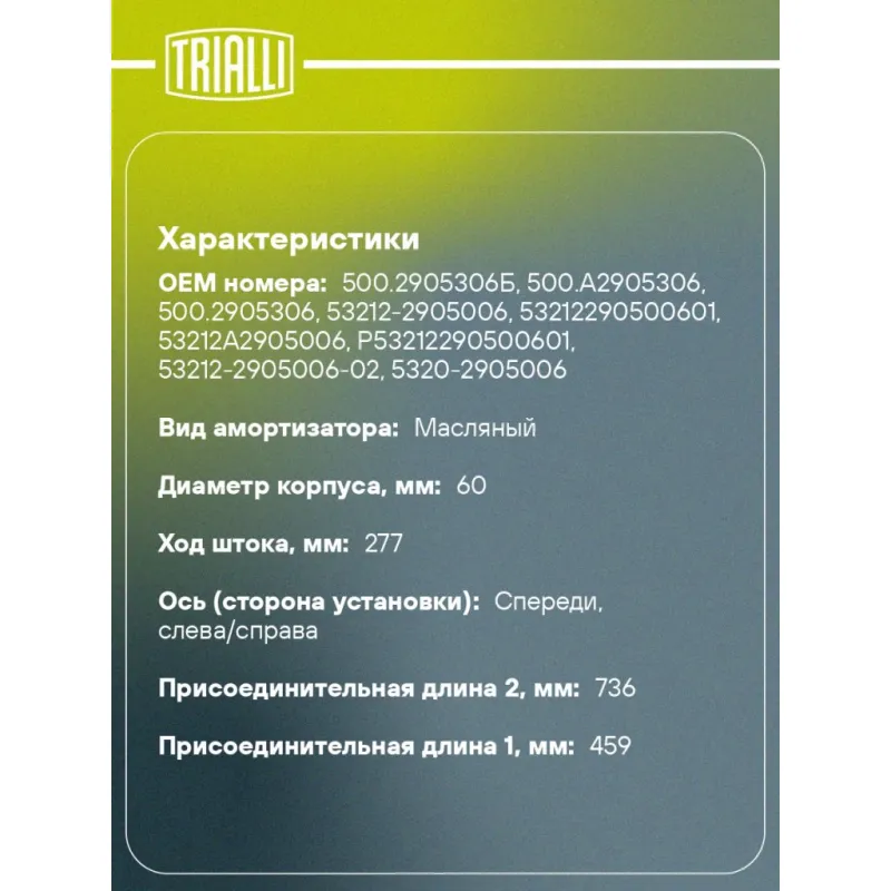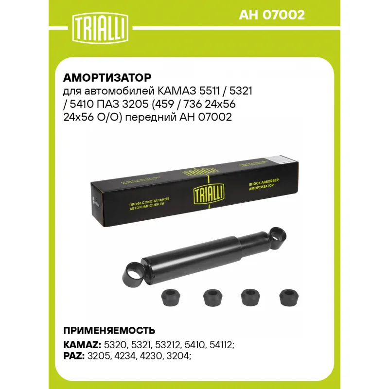 Амортизатор для автомобилей КАМАЗ 5511 / 5321 / 5410 ПАЗ 3205 (459 / 736 24х56 24х56 О/О) передний Описание: Амортизатор AH 07002 бренда TRIALLI – это устройство для гашения колебаний (демпфирования) и поглощения толчков и ударов, действующих на раму. Особенности AH 07002: - Вид – Масляный; - Тип – Двухтрубный, гидравлический; Для крепления к деталям кузова или подвески используются крепления: верхнее Проушина/втулка ; и нижнее Проушина/втулка. Совместим с: KAMAZ 5308, 53205, 53215, 53228, 53229, 54115, 55111, 55102, 53212, 5511, 55110, 5320, 5410, 53213, 54112, 5321, PAZ 4234, 4230, 3204, 3205.Подбор по VIN-номеру вашего автомобиля - через кнопку 'Задать вопрос'. Специалист проверит применяемость и ответит вам. Преимущества: - Инновационная технология производства; - Контроль качества каждой позиции по чертежам и с помощью 3D модели; - Сальник NOK; - Высокоэффективная система проектирования; - Гарантия до двух лет или 60 000 км пробега; Амортизаторы автомобильные существенно влияют на комфорт вождения, сокращая вибрации от неровностей дороги, что делает поездку более плавной и приятной. Регулярное и своевременное обслуживание амортизаторов помогут продлить их срок службы и обеспечить надёжную работу. Характеристики: Артикул: AH 07002 OEM номера: 500.2905306Б, 500.A2905306, 500.2905306, 53212-2905006, 53212290500601, 53212A2905006, P53212290500601, 53212-2905006-02, 5320-2905006, 5320-290500-61, 180-2915006-90, УЛИГ45299500160, 40УЛИГ452995021, 5320-2905006-11 Товарная линейка: BLACK Количество на автомобиль: 2 Вид амортизатора: Масляный Тип верхнего крепления: Проушина/втулка Тип нижнего крепления: Проушина/втулка Диаметр корпуса, мм: 60 Диаметр штока, мм: 20 Ход штока, мм: 277 Тип амортизатора: Двухтрубный, гидравлический Ось (сторона установки): Спереди, слева/справа Дополнительная информация: Упаковка изделия может отличаться от представленной на фото Присоединительная длина 2, мм: 736 Присоединительная длина 1, мм: 459 Сопутствующий товар: Амортизаторы: AH 07506; AH 07507; AH 07705 Гарантийный срок: 2 года/60 000 км Подходит для авто: КамаАЗ 5320, 5320, 5320, 5320, 5321, 5321, 53212, 53212, 53212, 5410, 5410, 54112, 55102, 55102, 5511, 5511, 5511, 54115, 55111, 55111 ПАЗ 3205, 3205, 3205, 4234, 4234, 4234, 4230, 4230, 4230, 3204 Для проверки применяемости отправьте VIN автомобиля через вкладку "Есть вопросы о товаре?" Комплектация: Амортизатор передний - 1 шт Втулка резиновая - 4 шт Гарантия: от 1 года.
