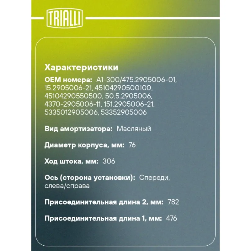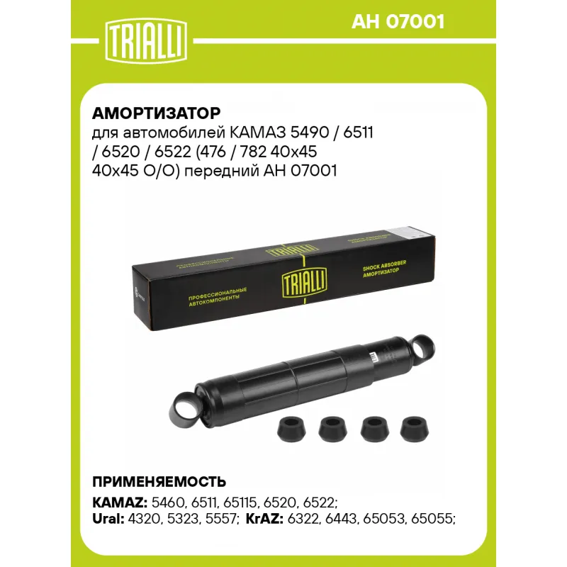 Амортизатор для автомобилей КАМАЗ 5490 / 6511 / 6520 / 6522 (476 / 782 40х45 40х45 О/О) передний Описание: Амортизатор AH 07001 бренда TRIALLI – это устройство для гашения колебаний (демпфирования) и поглощения толчков и ударов, действующих на раму. Особенности AH 07001: - Вид – Масляный; - Тип – Двухтрубный, гидравлический; Для крепления к деталям кузова или подвески используются крепления: верхнее Проушина/втулка ; и нижнее Проушина/втулка. Совместим с: KAMAZ 5490, 65111, 65115, 65116, 65117, 6520, 65201, 65206, 65207, 65208, 65209, 6522, 65221, 65222, 65224, 65225, 65226, 65228, 43253, 5460, 6511, KRAZ 6505, 6322, 6443, 65055, 65053, URAL 5557, 4320, 43206, 5323.Подбор по VIN-номеру вашего автомобиля - через кнопку 'Задать вопрос'. Специалист проверит применяемость и ответит вам. Преимущества: - Инновационная технология производства; - Контроль качества каждой позиции по чертежам и с помощью 3D модели; - Сальник NOK; - Высокоэффективная система проектирования; - Гарантия до двух лет или 60 000 км пробега; Амортизаторы автомобильные существенно влияют на комфорт вождения, сокращая вибрации от неровностей дороги, что делает поездку более плавной и приятной. Регулярное и своевременное обслуживание амортизаторов помогут продлить их срок службы и обеспечить надёжную работу. Характеристики: Артикул: AH 07001 OEM номера: А1-300/475.2905006-01, 15.2905006-21, 45104290500100, 45104290550500, 50.5.2905006, 4370-2905006-11, 151.2905006-21, 5335012905006, 53352905006, 650552905006, 5335290500601, 642212905006, A1-300/475.2905006-01 Товарная линейка: BLACK Количество на автомобиль: 2 Вид амортизатора: Масляный Тип верхнего крепления: Проушина/втулка Тип нижнего крепления: Проушина/втулка Диаметр корпуса, мм: 76 Диаметр штока, мм: 20 Ход штока, мм: 306 Тип амортизатора: Двухтрубный, гидравлический Ось (сторона установки): Спереди, слева/справа Дополнительная информация: Задние амортизаторы для двухосных автомобилей МАЗ с малолистовой рессорной задней подвеской, автобусов ЛАЗ, троллейбусов ЗиУ и Белкоммунмаш Присоединительная длина 2, мм: 782 Присоединительная длина 1, мм: 476 Гарантийный срок: 2 года/60 000 км Подходит для авто: КамаАЗ 5460, 6511, 65115, 6520, 6522, 43253, 5460, 6511, 65116, 65116, 65117, 65117, 6520, 6520, 6520, 6522, 6522, 6522 Ural 4320, 5323, 5557, 4320, 4320 КрАЗ 6322, 6443, 65053, 65055 Для проверки применяемости отправьте VIN автомобиля через вкладку "Есть вопросы о товаре?" Комплектация: Амортизатор передний - 1 шт Втулка резиновая - 4 шт Гарантия: от 1 года.