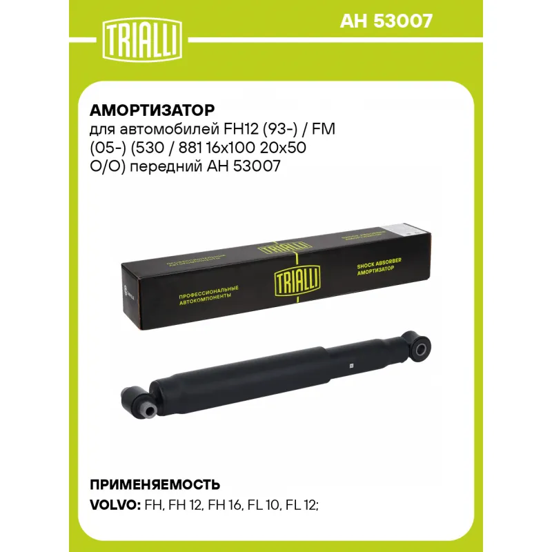 Амортизатор для автомобилей FH12 (93-) / FM (05-) (530 / 881 16x100 20x50 O/O) передний Описание: Амортизатор AH 53007 бренда TRIALLI – это устройство для гашения колебаний (демпфирования) и поглощения толчков и ударов, действующих на раму. Особенности AH 53007: - Вид – Масляный; - Тип – Двухтрубный, гидравлический; Для крепления к деталям кузова или подвески используются крепления: верхнее Проушина/сайлентблок ; и нижнее Проушина/сайлентблок. Совместим с: VOLVO FH, FL, FM.Подбор по VIN-номеру вашего автомобиля - через кнопку 'Задать вопрос'. Специалист проверит применяемость и ответит вам. Преимущества: - Инновационная технология производства; - Контроль качества каждой позиции по чертежам и с помощью 3D модели; - Сальник NOK; - Высокоэффективная система проектирования; - Гарантия до двух лет или 60 000 км пробега; Амортизаторы автомобильные существенно влияют на комфорт вождения, сокращая вибрации от неровностей дороги, что делает поездку более плавной и приятной. Регулярное и своевременное обслуживание амортизаторов помогут продлить их срок службы и обеспечить надёжную работу. Характеристики: Артикул: AH 53007 OEM номера: 20766061, 1609002 Товарная линейка: BLACK Количество на автомобиль: 2 Вид амортизатора: Масляный Тип верхнего крепления: Проушина/сайлентблок Тип нижнего крепления: Проушина/сайлентблок Диаметр корпуса, мм: 63.4 Диаметр штока, мм: 18 Ход штока, мм: 351 Тип амортизатора: Двухтрубный, гидравлический Ось (сторона установки): Спереди, слева/справа Дополнительная информация: Упаковка изделия может отличаться от представленной на фото Присоединительная длина 2, мм: 881 Присоединительная длина 1, мм: 530 Гарантийный срок: 2 года/60 000 км Комплектация: Амортизатор передний - 1 шт Гарантия: от 1 года.