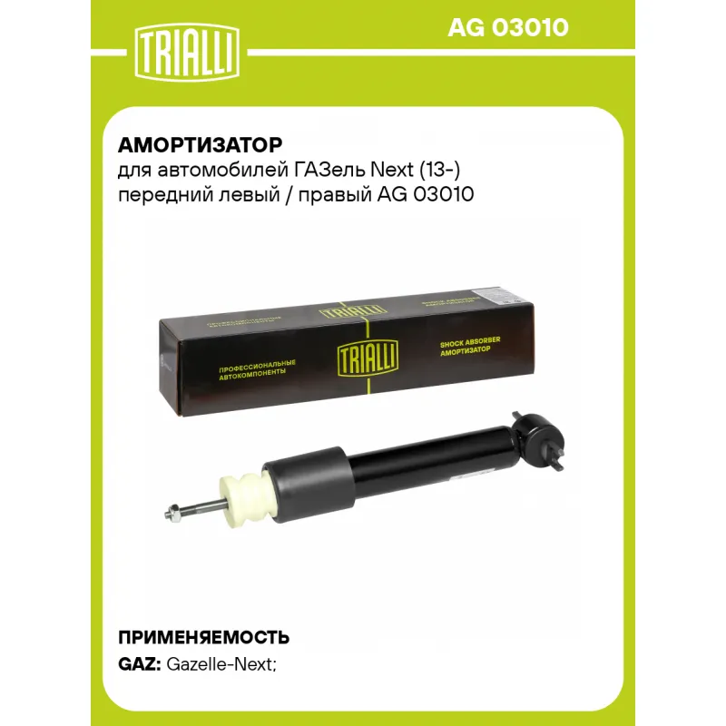 Амортизатор для автомобилей ГАЗель Next (13-) передний левый / правый Описание: Амортизатор бренда TRIALLI служит для гашения колебаний (демпфирования) и поглощения толчков и ударов, действующих на кузов (раму) автомобиля. Особенности: - Вид – Масляный с газовым подпором низкого давления; - Тип – Двухтрубный, гидравлический; Для крепления к деталям кузова автомобиля или подвески используется - верхнее крепление Шток M10x1.25; и нижнее крепление - Проушина/сайлентблок-поперечина. Применяемость: GAZ GAZELLE..Подбор по VIN-номеру вашего автомобиля - через кнопку 'Задать вопрос'. Специалист проверит применяемость и ответит вам. Преимущества: - Инновационная технология производства; - Контроль качества: - Дополнительная проверка с помощью 3D модели; - Сальник NOK; - Проверка каждой позиции по чертежам; - Высокоэффективная система проектирования; Амортизаторы автомобильные существенно влияют на комфорт вождения, поглощая удары и вибрации от неровностей дороги, что делает поездку более плавной и приятной.Регулярная проверка и своевременное обслуживание амортизаторов помогут продлить их срок службы и обеспечить надёжную работу. Характеристики: Артикул: AG 03010 OEM номера: A21R23.2905004, A31R32.2905004 Товарная линейка: BLACK Количество на автомобиль: 2 Вид амортизатора: Масляный с газовым подпором низкого давления Тип верхнего крепления: Шток Тип нижнего крепления: Проушина/сайлентблок-поперечина Диаметр корпуса, мм: 45 Диаметр штока, мм: 15 Ход штока, мм: 92 Размер резьбы штока: M10x1.25 Тип амортизатора: Двухтрубный, гидравлический Ось (сторона установки): Спереди, слева/справа Дополнительная информация: Упаковка изделия может отличаться от представленной на фото Присоединительная длина 2, мм: 336 Присоединительная длина 1, мм: 224 Сопутствующий товар: Амортизаторы: AG 03515 Гарантийный срок: 2 года/60 000 км Подходит для авто: ГАЗ Gazelle-Next (13-), Gazelle-Next (13-) Для проверки применяемости отправьте VIN автомобиля через вкладку "Есть вопросы о товаре?" Комплектация: Амортизатор передний - 1 шт Отбойник полиуретановый - 1 шт Кожух пылезащитный - 1 шт Гайка крепежная - 1 шт Шарнир резинометаллический - 1 шт Гарантия: от 1 года.