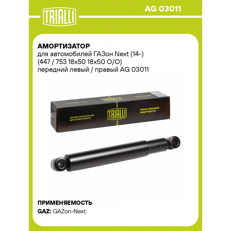 Амортизатор для автомобилей ГАЗон Next (14-) (447 / 753 18х50 18х50 О/О) передний левый / правый Описание: Амортизатор AG 03011 бренда TRIALLI – это устройство для гашения колебаний (демпфирования) и поглощения толчков и ударов, действующих на раму. Особенности AG 03011: - Вид – Масляный с газовым подпором низкого давления; - Тип – Двухтрубный, гидравлический; Для крепления к деталям кузова или подвески используются крепления: верхнее Проушина/сайлентблок ; и нижнее Проушина/сайлентблок. Совместим с: GAZ GAZON NEXT.Подбор по VIN-номеру вашего автомобиля - через кнопку 'Задать вопрос'. Специалист проверит применяемость и ответит вам. Преимущества: - Инновационная технология производства; - Контроль качества каждой позиции по чертежам и с помощью 3D модели; - Сальник NOK; - Высокоэффективная система проектирования; - Гарантия до двух лет или 60 000 км пробега; Амортизаторы автомобильные существенно влияют на комфорт вождения, сокращая вибрации от неровностей дороги, что делает поездку более плавной и приятной. Регулярное и своевременное обслуживание амортизаторов помогут продлить их срок службы и обеспечить надёжную работу. Характеристики: Артикул: AG 03011 OEM номера: C41R11.2905004, C40R13.2905004, C40R13.2905004-01, C40R13.2905004-03 Товарная линейка: BLACK Количество на автомобиль: 2 Вид амортизатора: Масляный с газовым подпором низкого давления Тип верхнего крепления: Проушина/сайлентблок Тип нижнего крепления: Проушина/сайлентблок Диаметр корпуса, мм: 51 Диаметр штока, мм: 15 Ход штока, мм: 306 Тип амортизатора: Двухтрубный, гидравлический Ось (сторона установки): Спереди, слева/справа Дополнительная информация: Упаковка изделия может отличаться от представленной на фото Присоединительная длина 2, мм: 753 Присоединительная длина 1, мм: 447 Гарантийный срок: 2 года/60 000 км Подходит для авто: ГАЗ GAZon-Next (14-) Для проверки применяемости отправьте VIN автомобиля через вкладку "Есть вопросы о товаре?" Комплектация: Амортизатор передний - 1 шт Шарнир резинометаллический - 2 шт Гарантия: от 1 года.