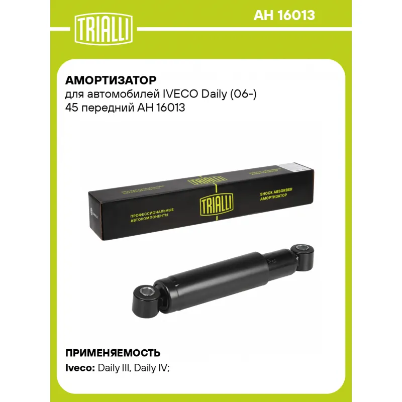 Амортизатор для автомобилей IVECO Daily (06-) 45 передний Описание: Амортизатор AH 16013 бренда TRIALLI – это устройство для гашения колебаний (демпфирования) и поглощения толчков и ударов, действующих на раму. Особенности AH 16013: - Вид – Масляный; - Тип – Двухтрубный, гидравлический; Для крепления к деталям кузова или подвески используются крепления: верхнее Проушина/сайлентблок ; и нижнее Проушина/сайлентблок. Совместим с: IVECO DAILY.Подбор по VIN-номеру вашего автомобиля - через кнопку 'Задать вопрос'. Специалист проверит применяемость и ответит вам. Преимущества: - Инновационная технология производства; - Контроль качества каждой позиции по чертежам и с помощью 3D модели; - Сальник NOK; - Высокоэффективная система проектирования; - Гарантия до двух лет или 60 000 км пробега; Амортизаторы автомобильные существенно влияют на комфорт вождения, сокращая вибрации от неровностей дороги, что делает поездку более плавной и приятной. Регулярное и своевременное обслуживание амортизаторов помогут продлить их срок службы и обеспечить надёжную работу. Характеристики: Артикул: AH 16013 OEM номера: 98415332 Товарная линейка: BLACK Количество на автомобиль: 2 Вид амортизатора: Масляный Тип верхнего крепления: Проушина/сайлентблок Тип нижнего крепления: Проушина/сайлентблок Диаметр корпуса, мм: 38 Диаметр штока, мм: 12.5 Ход штока, мм: 157 Тип амортизатора: Двухтрубный, гидравлический Ось (сторона установки): Спереди, слева/справа Дополнительная информация: Для а/м грузоподъёмностью более 1200 кг серии 35S, 35C, 40С, 45С, 50С, 60С, 65С, 70С Присоединительная длина 2, мм: 448±3 Присоединительная длина 1, мм: 291±3 Гарантийный срок: 2 года/60 000 км Подходит для авто: Iveco Daily III (99-), Daily IV (06-) Для проверки применяемости отправьте VIN автомобиля через вкладку "Есть вопросы о товаре?" Комплектация: Шарнир резинометаллический - 2 шт Амортизатор передний - 1 шт Гарантия: от 1 года.