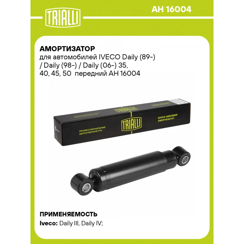 Амортизатор для автомобилей IVECO Daily (89-) / Daily (98-) / Daily (06-) 35, 40, 45, 50 передний Описание: Амортизатор AH 16004 бренда TRIALLI – это устройство для гашения колебаний (демпфирования) и поглощения толчков и ударов, действующих на раму. Особенности AH 16004: - Вид – Масляный; - Тип – Двухтрубный, гидравлический; Для крепления к деталям кузова или подвески используются крепления: верхнее Проушина/сайлентблок ; и нижнее Проушина/сайлентблок. Совместим с: IVECO DAILY.Подбор по VIN-номеру вашего автомобиля - через кнопку 'Задать вопрос'. Специалист проверит применяемость и ответит вам. Преимущества: - Инновационная технология производства; - Контроль качества каждой позиции по чертежам и с помощью 3D модели; - Сальник NOK; - Высокоэффективная система проектирования; - Гарантия до двух лет или 60 000 км пробега; Амортизаторы автомобильные существенно влияют на комфорт вождения, сокращая вибрации от неровностей дороги, что делает поездку более плавной и приятной. Регулярное и своевременное обслуживание амортизаторов помогут продлить их срок службы и обеспечить надёжную работу. Характеристики: Артикул: AH 16004 OEM номера: 5801345775, 504088409 Товарная линейка: BLACK Количество на автомобиль: 2 Вид амортизатора: Масляный Тип верхнего крепления: Проушина/сайлентблок Тип нижнего крепления: Проушина/сайлентблок Диаметр корпуса, мм: 51 Диаметр штока, мм: 15 Ход штока, мм: 82 Тип амортизатора: Двухтрубный, гидравлический Ось (сторона установки): Спереди, слева/справа Дополнительная информация: Для а/м грузоподъёмностью до 1200 кг серии 29L, 35S и 25C Присоединительная длина 2, мм: 404±3 Присоединительная длина 1, мм: 322±3 Сопутствующий товар: Амортизаторы: AG 16526 Гарантийный срок: 2 года/60 000 км Подходит для авто: Iveco Daily III (99-), Daily IV (06-) Для проверки применяемости отправьте VIN автомобиля через вкладку "Есть вопросы о товаре?" Комплектация: Шарнир резинометаллический - 2 шт Амортизатор передний - 1 шт Гарантия: от 1 года.
