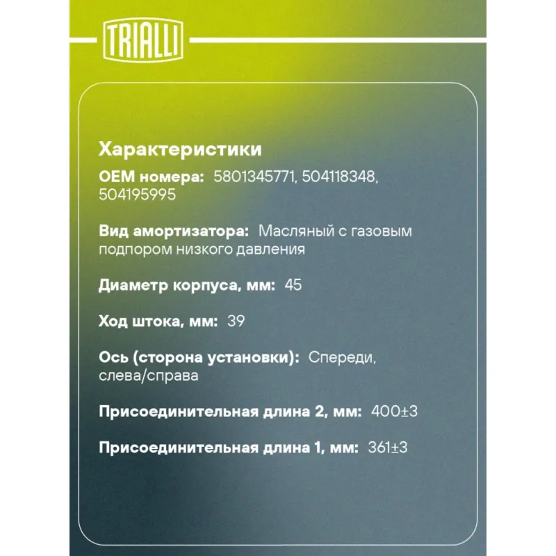 Амортизатор для автомобилей IVECO Daily (98-) 29, 35 передний левый / правый Описание: Амортизатор AG 16001 бренда TRIALLI – это устройство для гашения колебаний (демпфирования) и поглощения толчков и ударов, действующих на раму. Особенности AG 16001: - Вид – Масляный с газовым подпором низкого давления; - Тип – Двухтрубный, гидравлический; Для крепления к деталям кузова или подвески используются крепления: верхнее Проушина/сайлентблок ; и нижнее Проушина/сайлентблок. Совместим с: IVECO DAILY.Подбор по VIN-номеру вашего автомобиля - через кнопку 'Задать вопрос'. Специалист проверит применяемость и ответит вам. Преимущества: - Инновационная технология производства; - Контроль качества каждой позиции по чертежам и с помощью 3D модели; - Сальник NOK; - Высокоэффективная система проектирования; - Гарантия до двух лет или 60 000 км пробега; Амортизаторы автомобильные существенно влияют на комфорт вождения, сокращая вибрации от неровностей дороги, что делает поездку более плавной и приятной. Регулярное и своевременное обслуживание амортизаторов помогут продлить их срок службы и обеспечить надёжную работу. Характеристики: Артикул: AG 16001 OEM номера: 5801345771, 504118348, 504195995 Товарная линейка: BLACK Количество на автомобиль: 2 Вид амортизатора: Масляный с газовым подпором низкого давления Тип верхнего крепления: Проушина/сайлентблок Тип нижнего крепления: Проушина/сайлентблок Диаметр корпуса, мм: 45 Диаметр штока, мм: 12.5 Ход штока, мм: 39 Тип амортизатора: Двухтрубный, гидравлический Ось (сторона установки): Спереди, слева/справа Дополнительная информация: Упаковка изделия может отличаться от представленной на фото Присоединительная длина 2, мм: 400±3 Присоединительная длина 1, мм: 361±3 Гарантийный срок: 2 года/60 000 км Комплектация: Амортизатор передний - 1 шт Шарнир резинометаллический - 2 шт Гарантия: от 1 года.