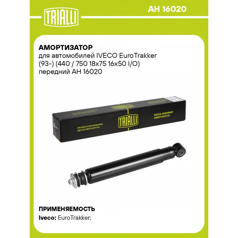 Амортизатор для автомобилей IVECO EuroTrakker (93-) (440 / 750 18x75 16x50 I/O) передний Описание: Амортизатор AH 16020 бренда TRIALLI – это устройство для гашения колебаний (демпфирования) и поглощения толчков и ударов, действующих на раму. Особенности AH 16020: - Вид – Масляный; - Тип – Двухтрубный, гидравлический; Для крепления к деталям кузова или подвески используются крепления: верхнее Шток M14x1.5; и нижнее Проушина/сайлентблок. Совместим с: IVECO EUROTECH, EUROTRAKKER.Подбор по VIN-номеру вашего автомобиля - через кнопку 'Задать вопрос'. Специалист проверит применяемость и ответит вам. Преимущества: - Инновационная технология производства; - Контроль качества каждой позиции по чертежам и с помощью 3D модели; - Сальник NOK; - Высокоэффективная система проектирования; - Гарантия до двух лет или 60 000 км пробега; Амортизаторы автомобильные существенно влияют на комфорт вождения, сокращая вибрации от неровностей дороги, что делает поездку более плавной и приятной. Регулярное и своевременное обслуживание амортизаторов помогут продлить их срок службы и обеспечить надёжную работу. Характеристики: Артикул: AH 16020 OEM номера: 41272149 Товарная линейка: BLACK Количество на автомобиль: 2 Вид амортизатора: Масляный Тип верхнего крепления: Шток Тип нижнего крепления: Проушина/сайлентблок Диаметр корпуса, мм: 54 Диаметр штока, мм: 16 Ход штока, мм: 310 Размер резьбы штока: M14x1.5 Тип амортизатора: Двухтрубный, гидравлический Ось (сторона установки): Спереди, слева/справа Присоединительная длина 2, мм: 744±3 Присоединительная длина 1, мм: 434±3 Гарантийный срок: 2 года/60 000 км Подходит для авто: Iveco EuroTrakker (99-) Для проверки применяемости отправьте VIN автомобиля через вкладку "Есть вопросы о товаре?" Комплектация: Амортизатор передний - 1 шт Шарнир резинометаллический - 1 шт Подушка резиновая - 2 шт Шайба - 3 шт Втулка дистанционная - 1 шт Гайка крепежная - 1 шт Гарантия: от 1 года.