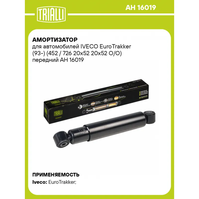 Амортизатор для автомобилей IVECO EuroTrakker (93-) (452 / 726 20x52 20x52 O/O) передний Описание: Амортизатор AH 16019 бренда TRIALLI – это устройство для гашения колебаний (демпфирования) и поглощения толчков и ударов, действующих на раму. Особенности AH 16019: - Вид – Масляный; - Тип – Двухтрубный, гидравлический; Для крепления к деталям кузова или подвески используются крепления: верхнее Проушина/сайлентблок ; и нижнее Проушина/сайлентблок. Совместим с: IVECO EUROTRAKKER.Подбор по VIN-номеру вашего автомобиля - через кнопку 'Задать вопрос'. Специалист проверит применяемость и ответит вам. Преимущества: - Инновационная технология производства; - Контроль качества каждой позиции по чертежам и с помощью 3D модели; - Сальник NOK; - Высокоэффективная система проектирования; - Гарантия до двух лет или 60 000 км пробега; Амортизаторы автомобильные существенно влияют на комфорт вождения, сокращая вибрации от неровностей дороги, что делает поездку более плавной и приятной. Регулярное и своевременное обслуживание амортизаторов помогут продлить их срок службы и обеспечить надёжную работу. Характеристики: Артикул: AH 16019 OEM номера: 41272902 Товарная линейка: BLACK Количество на автомобиль: 2 Вид амортизатора: Масляный Тип верхнего крепления: Проушина/сайлентблок Тип нижнего крепления: Проушина/сайлентблок Диаметр корпуса, мм: 65 Диаметр штока, мм: 20 Ход штока, мм: 275 Тип амортизатора: Двухтрубный, гидравлический Ось (сторона установки): Спереди, слева/справа Присоединительная длина 2, мм: 725±3 Присоединительная длина 1, мм: 450±3 Гарантийный срок: 2 года/60 000 км Подходит для авто: Iveco EuroTrakker (99-) Для проверки применяемости отправьте VIN автомобиля через вкладку "Есть вопросы о товаре?" Комплектация: Амортизатор передний - 1 шт Шарнир резинометаллический - 1 шт Гарантия: от 1 года.
