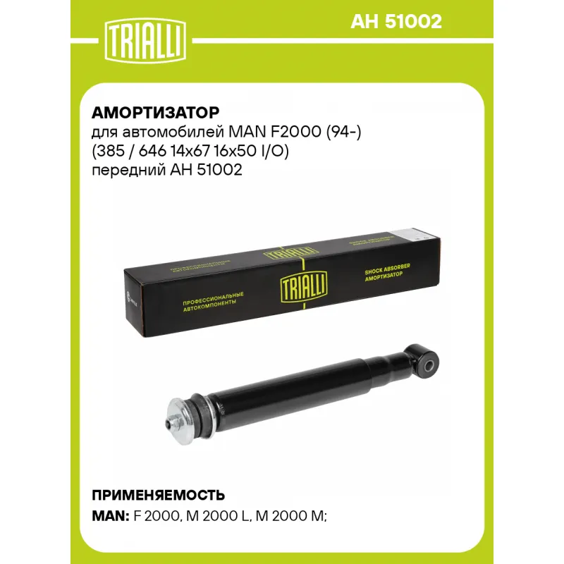 Амортизатор для автомобилей MAN F2000 (94-) (385 / 646 14х67 16х50 I/O) передний Описание: Амортизатор AH 51002 бренда TRIALLI – это устройство для гашения колебаний (демпфирования) и поглощения толчков и ударов, действующих на раму. Особенности AH 51002: - Вид – Масляный; - Тип – Двухтрубный, гидравлический; Для крепления к деталям кузова или подвески используются крепления: верхнее Шток M14x1.5; и нижнее Проушина/сайлентблок. Совместим с: MAN F2000, M2000.Подбор по VIN-номеру вашего автомобиля - через кнопку 'Задать вопрос'. Специалист проверит применяемость и ответит вам. Преимущества: - Инновационная технология производства; - Контроль качества каждой позиции по чертежам и с помощью 3D модели; - Сальник NOK; - Высокоэффективная система проектирования; - Гарантия до двух лет или 60 000 км пробега; Амортизаторы автомобильные существенно влияют на комфорт вождения, сокращая вибрации от неровностей дороги, что делает поездку более плавной и приятной. Регулярное и своевременное обслуживание амортизаторов помогут продлить их срок службы и обеспечить надёжную работу. Характеристики: Артикул: AH 51002 OEM номера: 81.43701-6793 Товарная линейка: BLACK Количество на автомобиль: 2 Вид амортизатора: Масляный Тип верхнего крепления: Шток Тип нижнего крепления: Проушина/сайлентблок Диаметр корпуса, мм: 50.8 Диаметр штока, мм: 16 Ход штока, мм: 261 Размер резьбы штока: M14x1.5 Тип амортизатора: Двухтрубный, гидравлический Ось (сторона установки): Спереди, слева/справа Присоединительная длина 2, мм: 645 Присоединительная длина 1, мм: 384 Гарантийный срок: 2 года/60 000 км Комплектация: Амортизатор передний - 1 шт Подушка резиновая - 2 шт Шайба - 2 шт Гайка крепежная - 1 шт Втулка распорная - 1 шт Шарнир резинометаллический - 1 шт Гарантия: от 1 года.